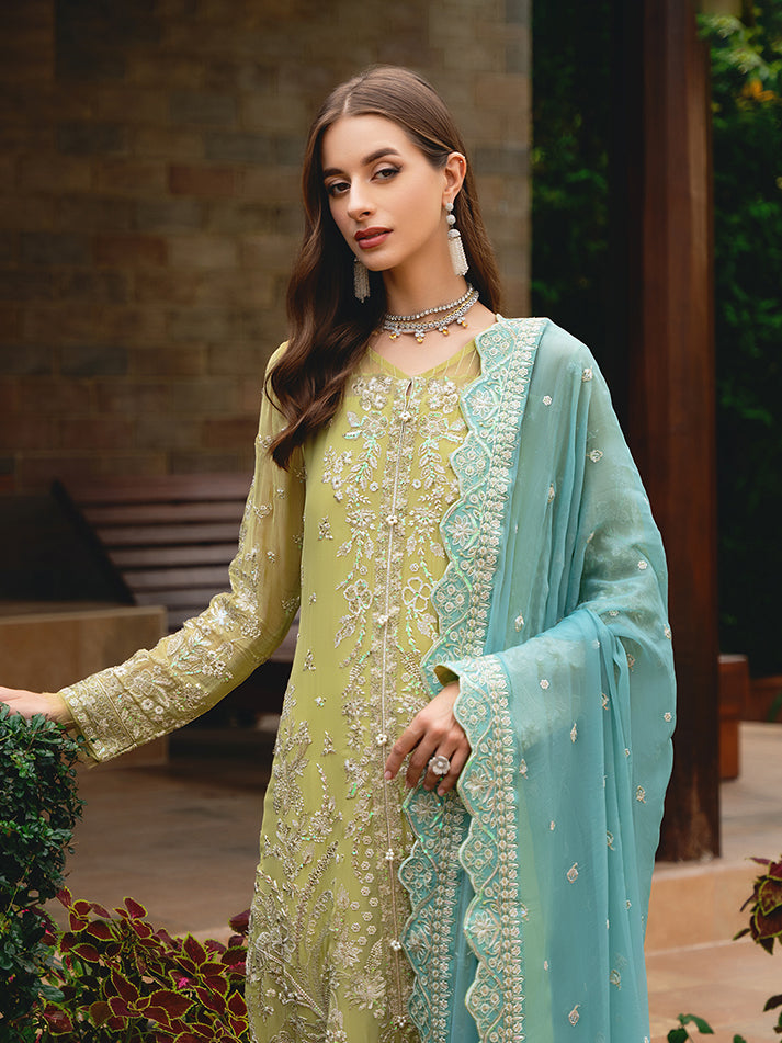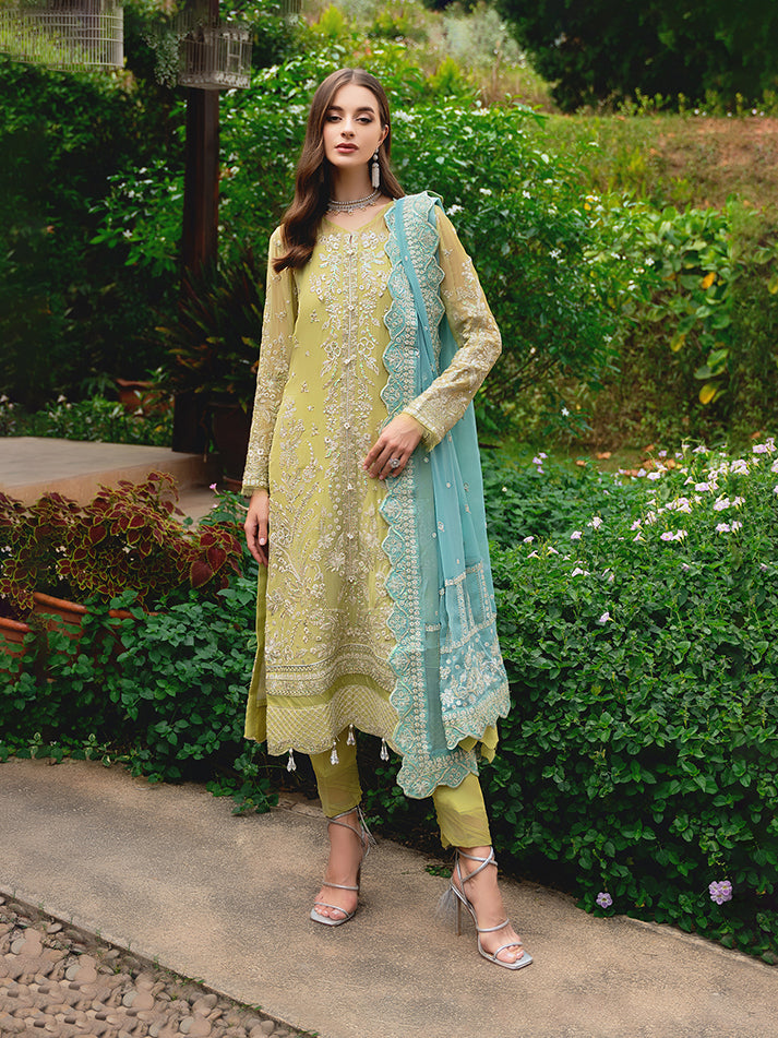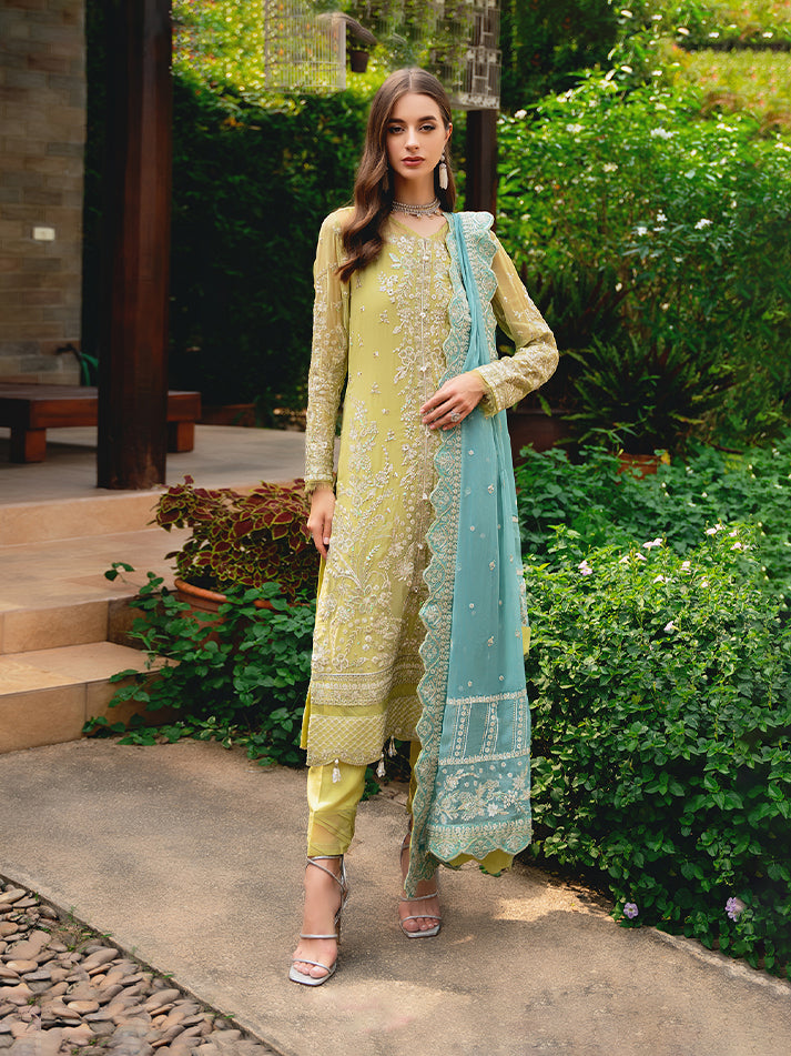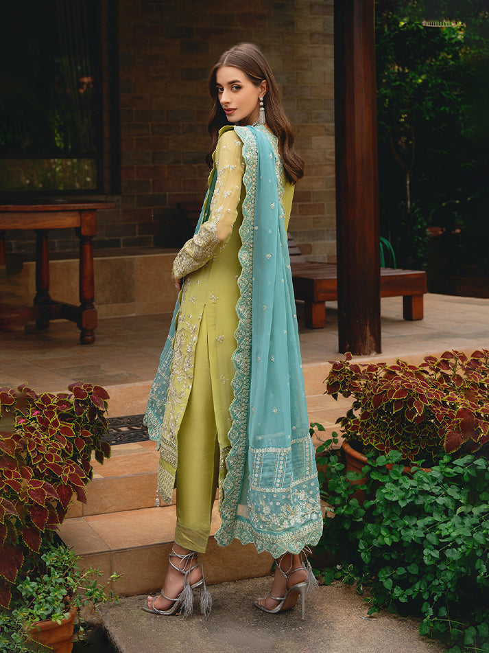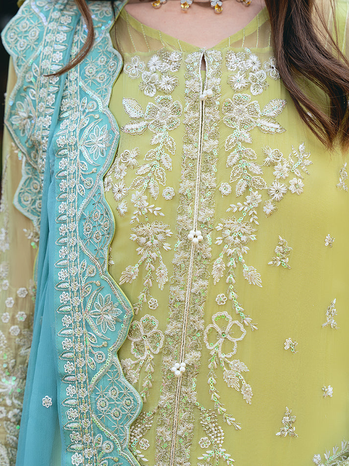 Amary - a timeless and elegant ensemble exuding the serene charm of a soft canary hue, delicately adorned with intricately embroidered motifs. The shirt is complemented by a beautiful scalloped power blue chiffon dupatta, embellished with embroidery and sequins across its edges, and paired with tonal raw silk pants.