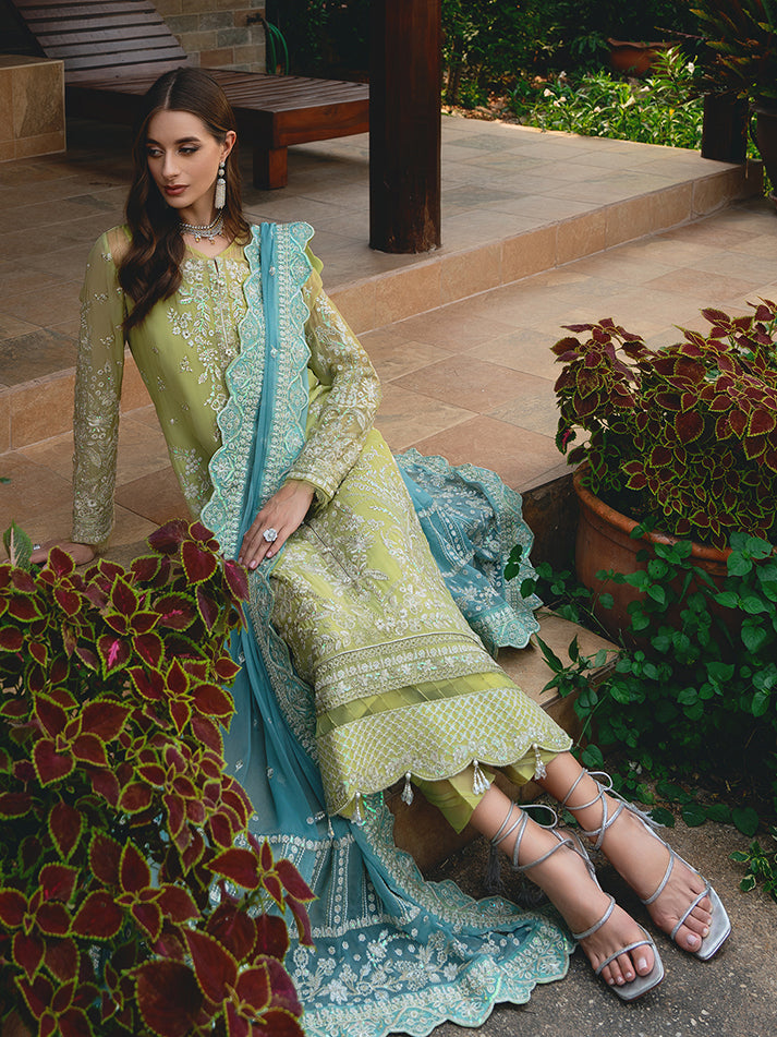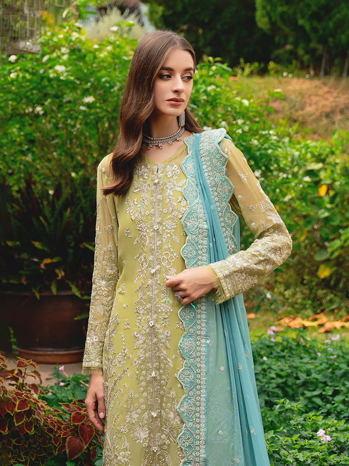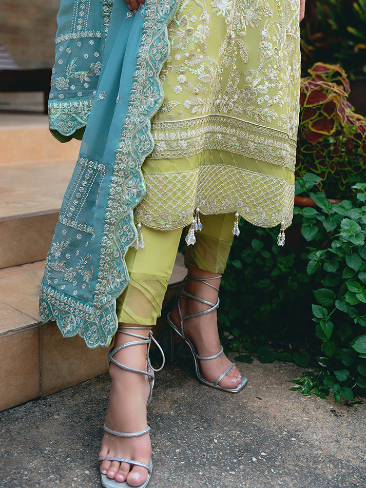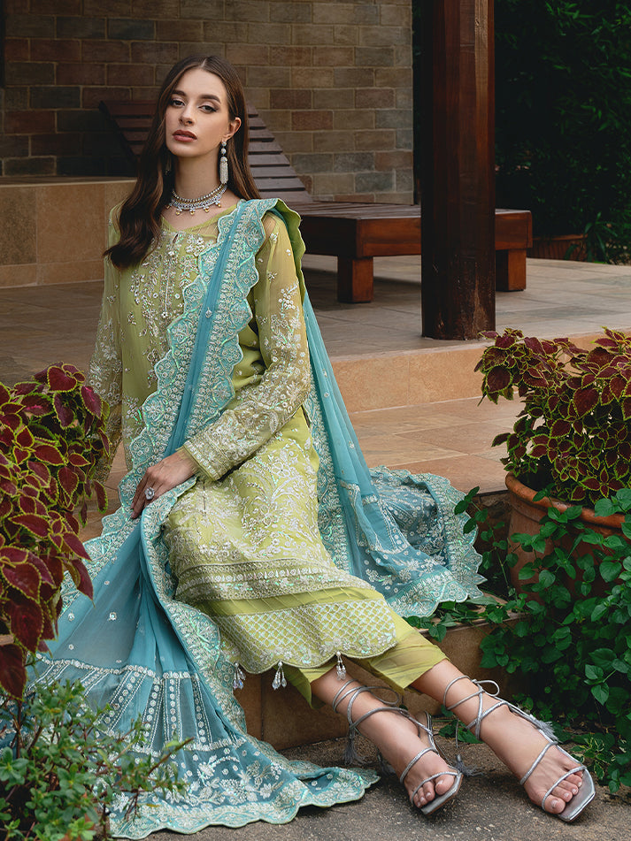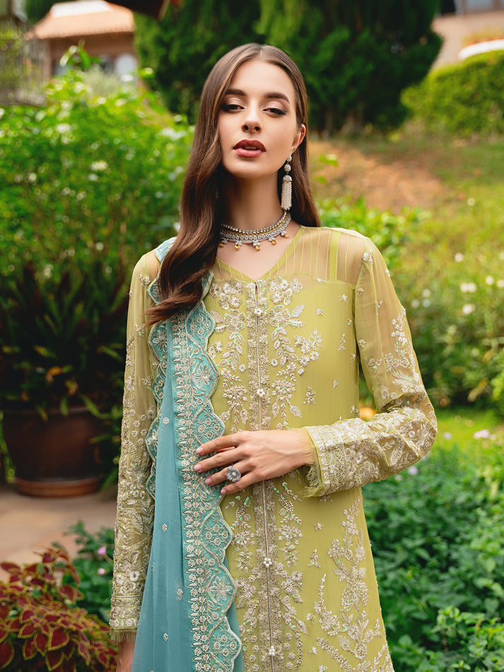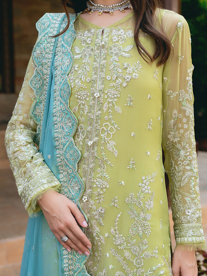 Amary - a timeless and elegant ensemble exuding the serene charm of a soft canary hue, delicately adorned with intricately embroidered motifs. The shirt is complemented by a beautiful scalloped power blue chiffon dupatta, embellished with embroidery and sequins across its edges, and paired with tonal raw silk pants.