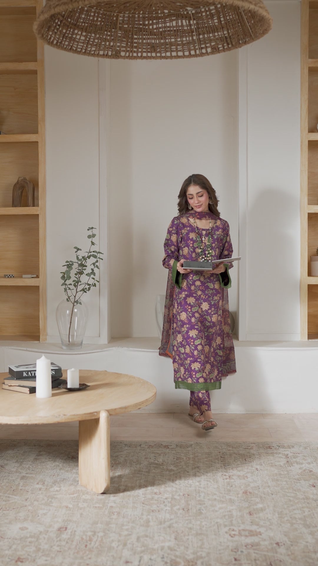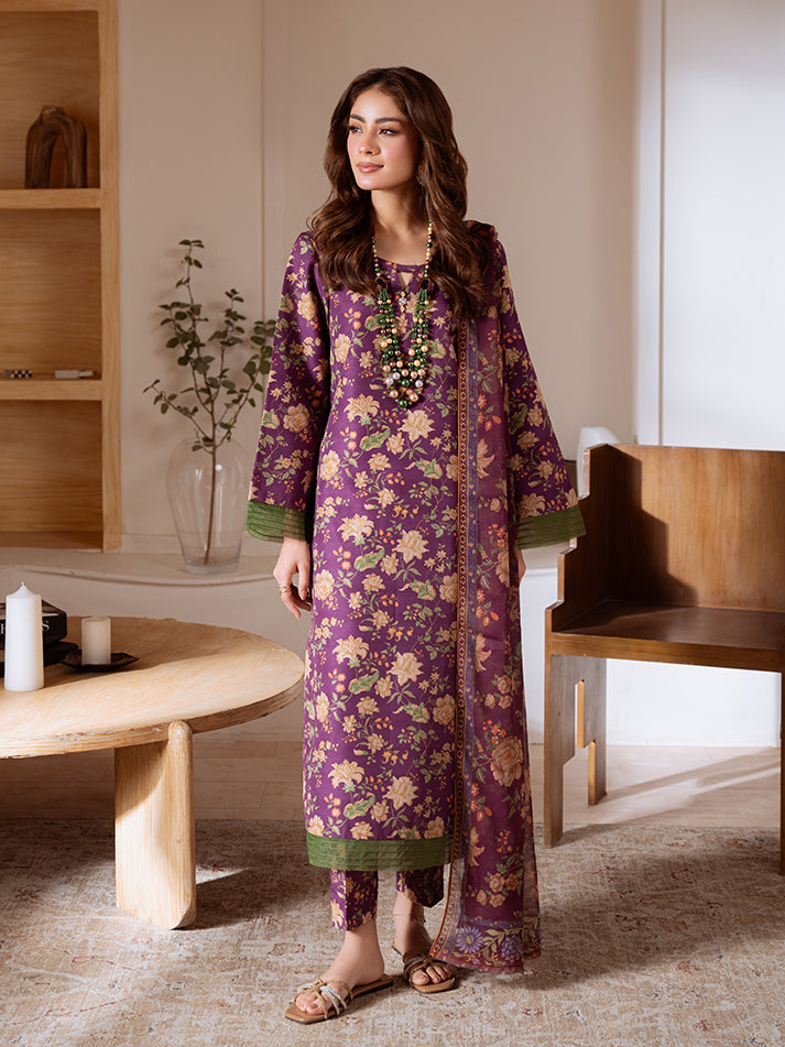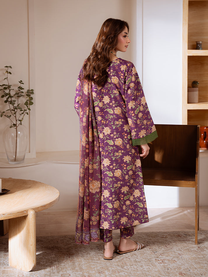Amethyst Bloom is a graceful three-piece set, designed on a deep purple poly lawn base adorned with delicate floral detailing. The outfit is beautifully enhanced with green organza accents that add a touch of freshness and charm. Paired with a flowing chiffon dupatta, this ensemble strikes the perfect balance between elegance and sophistication, making it a timeless addition to your wardrobe.