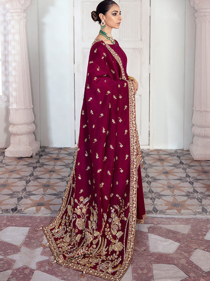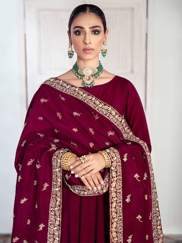 Rich garnet colored pure korean raw silk shawl with heavily composed shikargah composition, hand embellished pallu finished off with beautiful floral borders. Different handwork techniques have been merged together to create this masterpiece which is fully hand-worked. Furthermore, it is paired with panelled kalidaar having handwork borders on hem and sleeves.