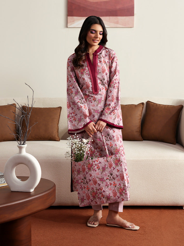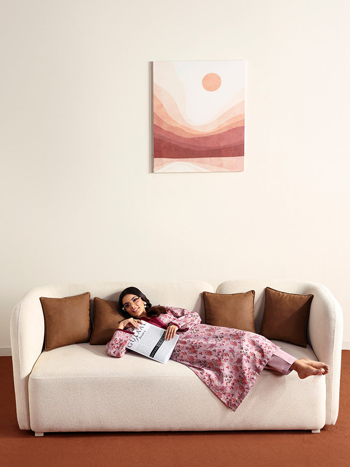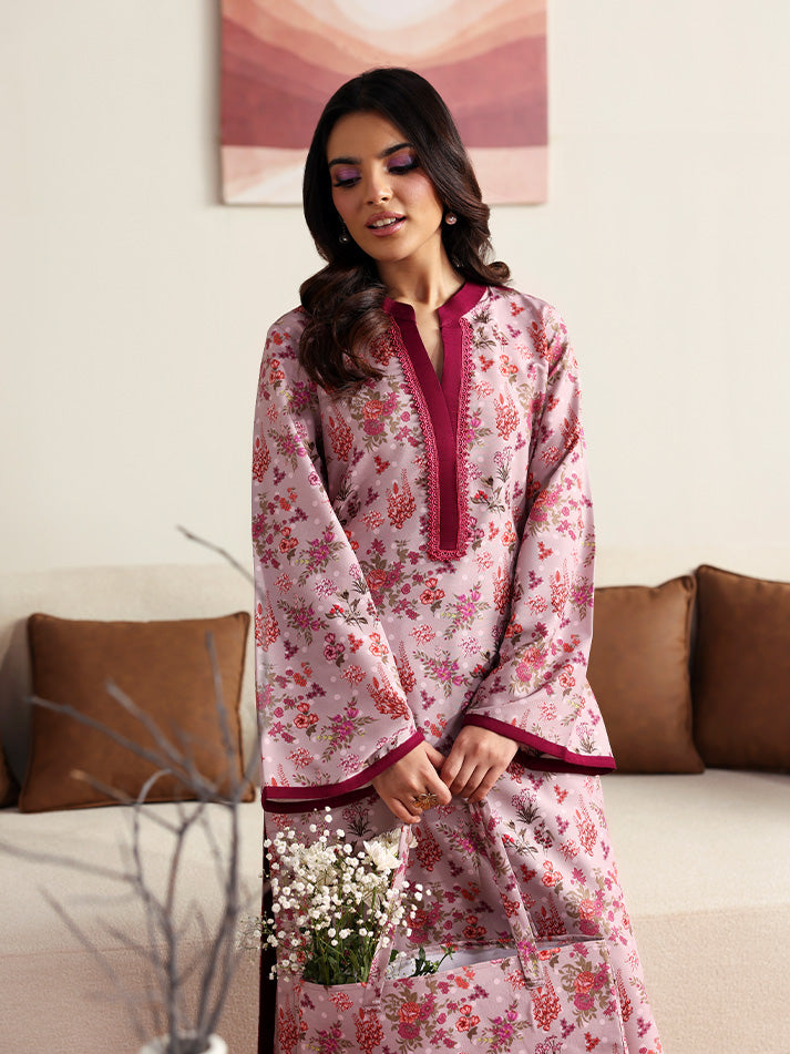 Blossom captures the essence of soft femininity with its serene pale lilac base, brought to life through an all-over floral print. The sleeves are finished with a striking dark magenta trim, adding a subtle yet eye-catching contrast. Paired with a playful printed trouser featuring delicate polka dots, this ensemble blends charm and comfort in the most effortless way.