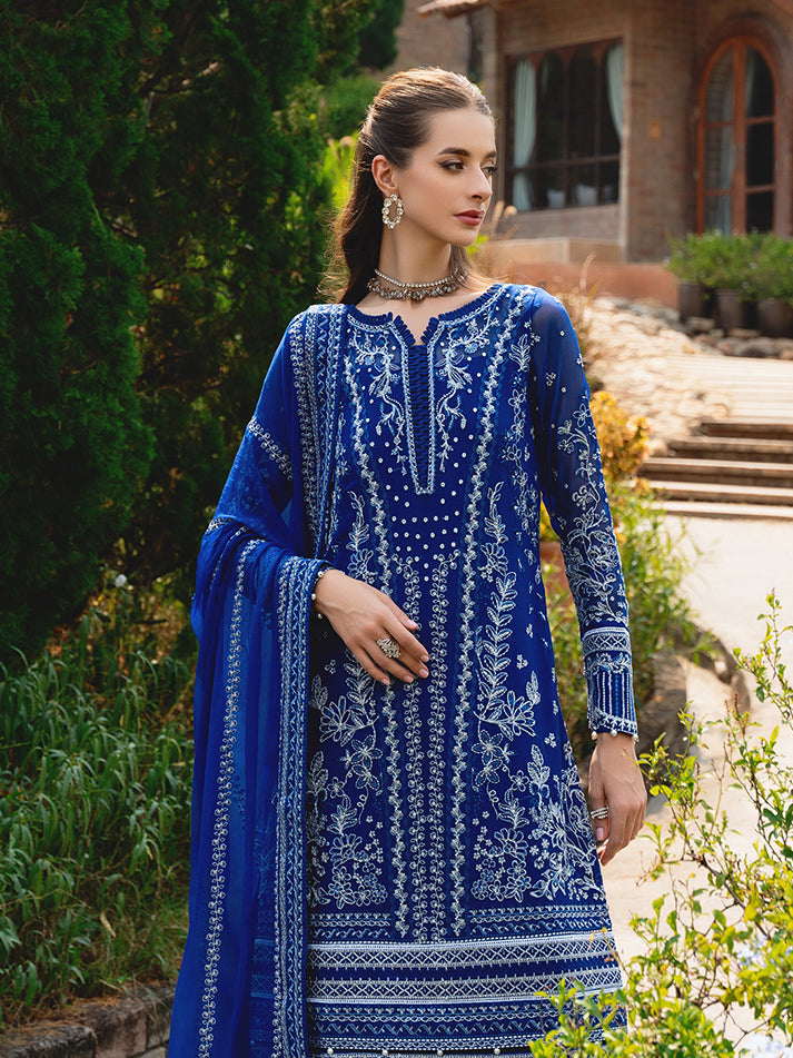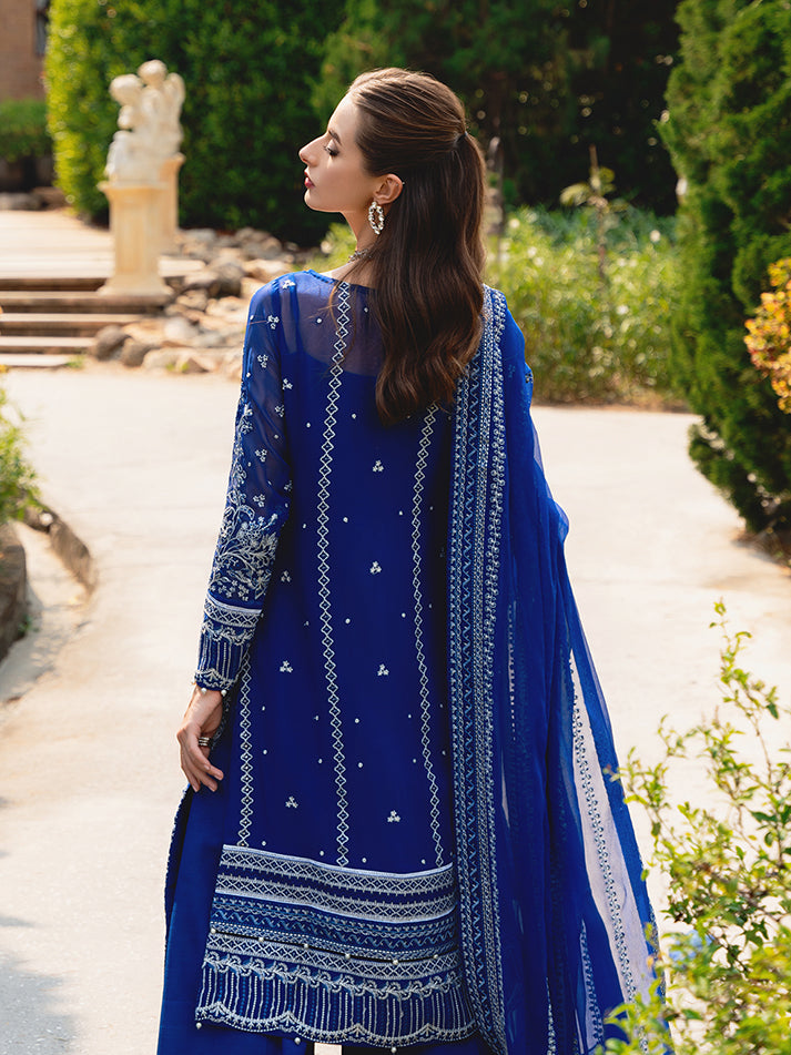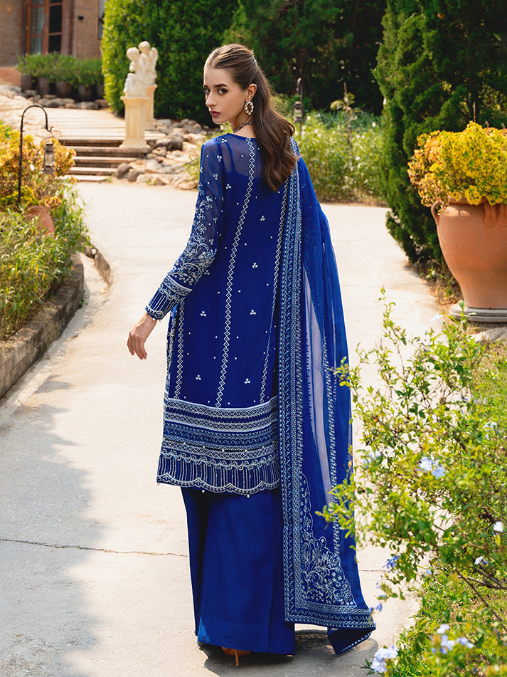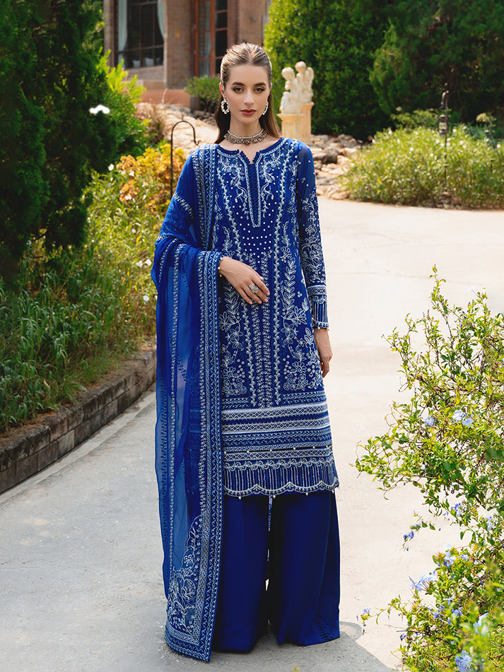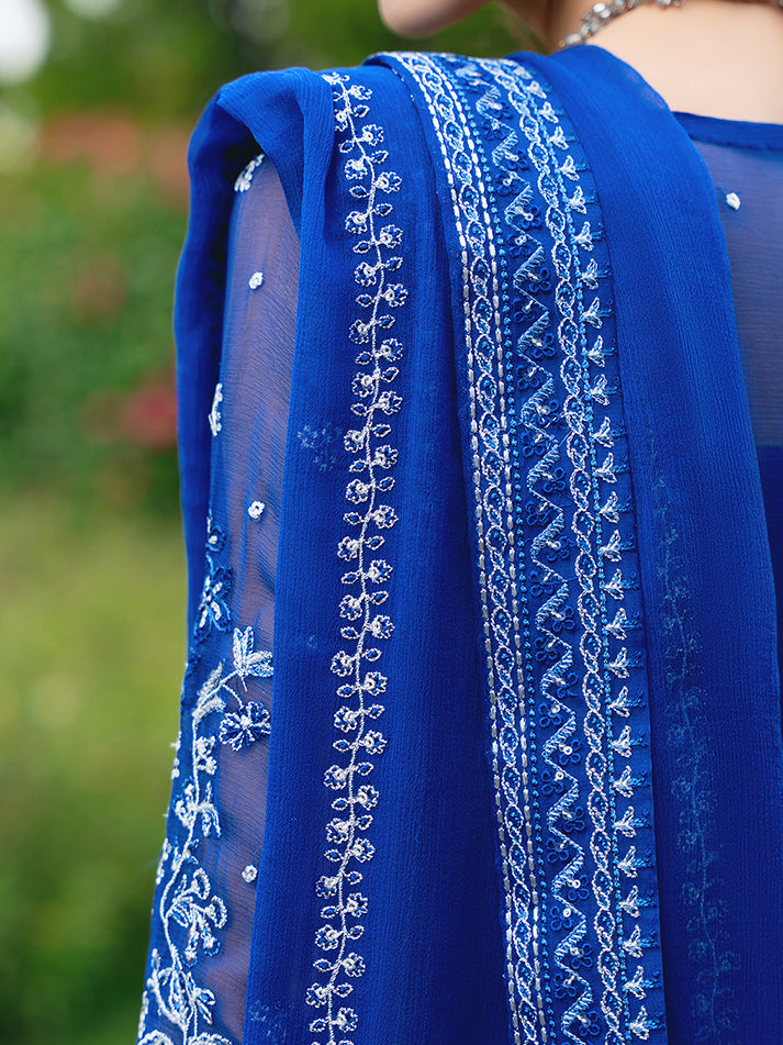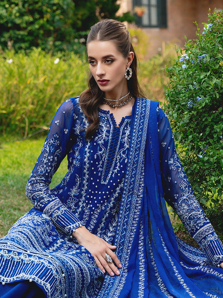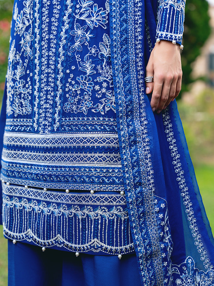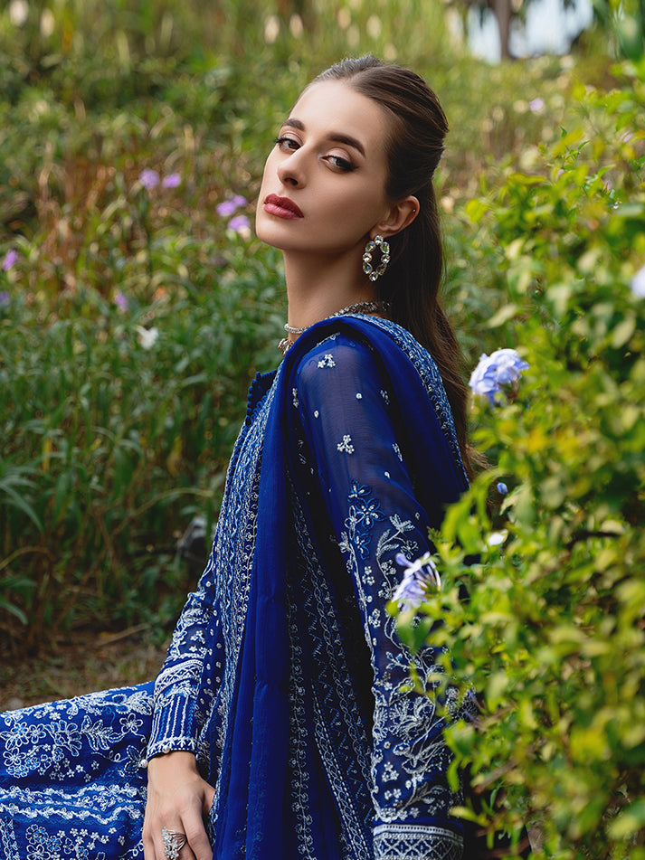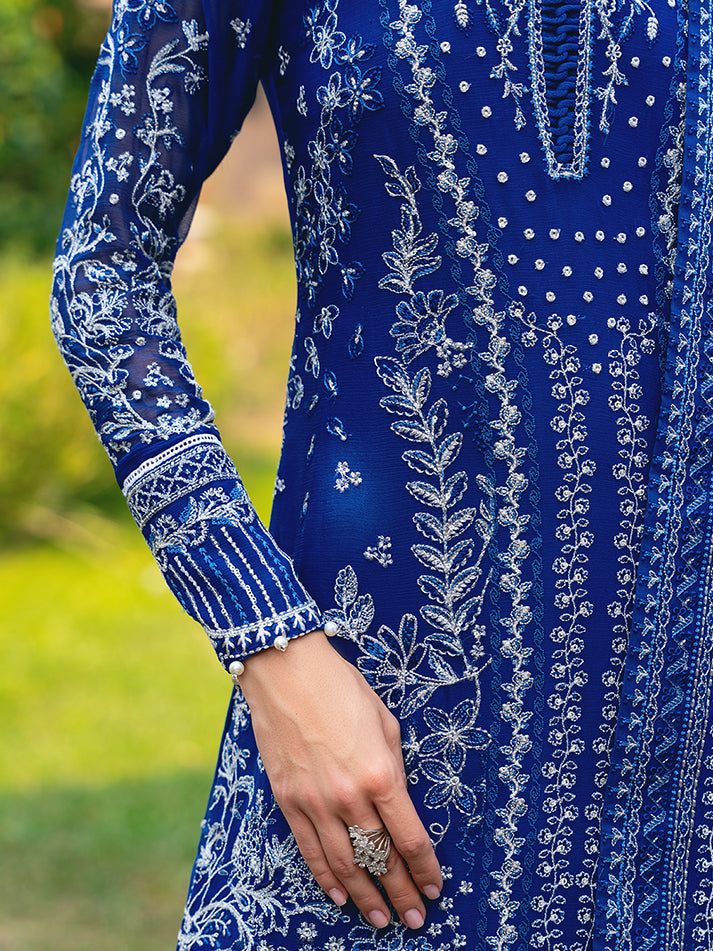 Navy blue chiffon blossoms with intricate floral patterns, adorned in shades of ivory, sapphire, electric blue, and periwinkle, heightened by iridescent accents. 'Celise' is adorned with dazzling embroideries, creating a divine composition. The diaphanous tonal dupatta boasts delicate lush embroidered borders, while the raw silk pants culminate in a meticulously detailed formal ensemble that truly stands as an enduring treasure.