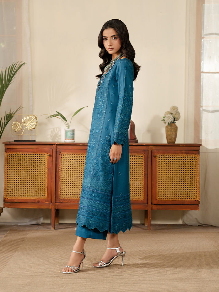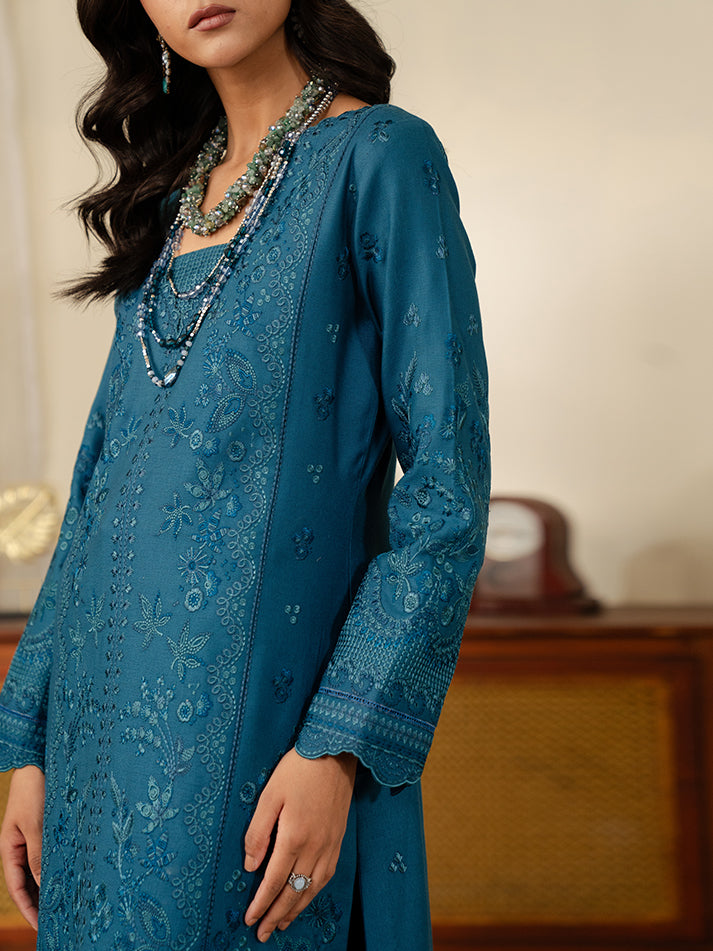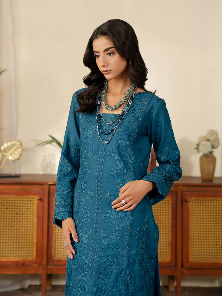 The outfit that is bound to make a statement - deep teal blue karandi base serves as the canvas for this fully embroidered shirt stitched together as a fully composed center panel along with embroidered panels for left & right of the shirt. Chic, quirky and worthy of a style statement - definitely our pick for the season