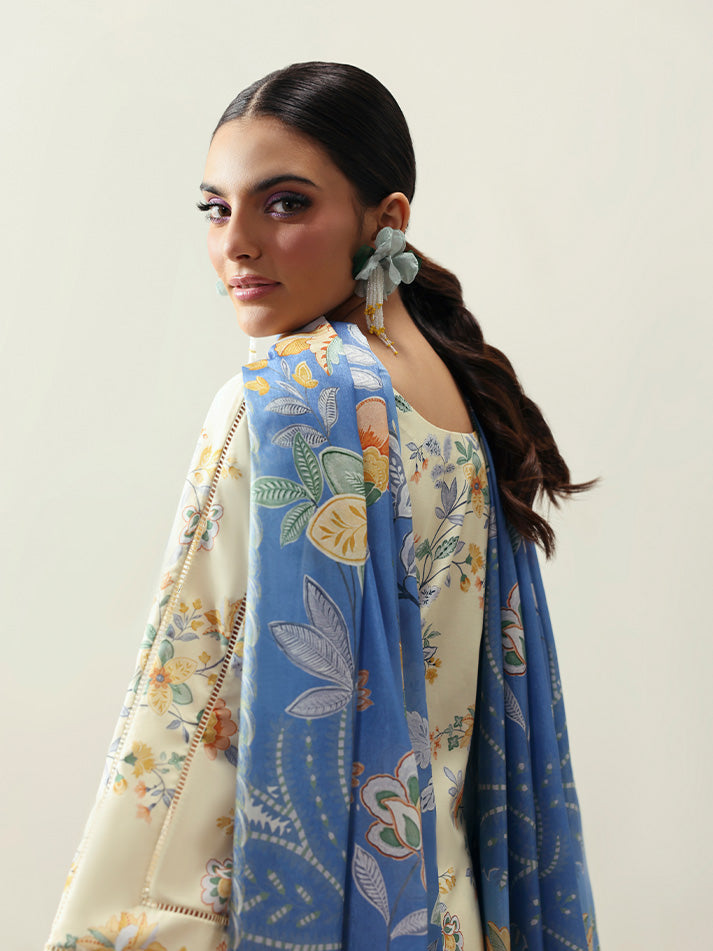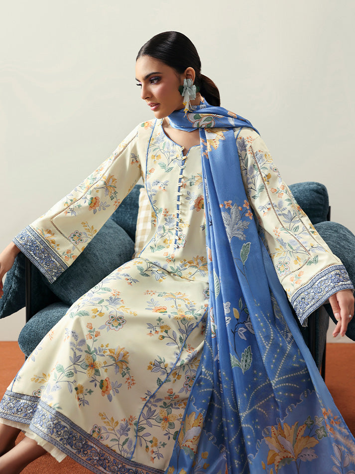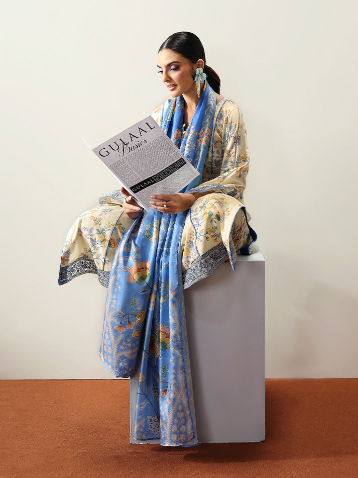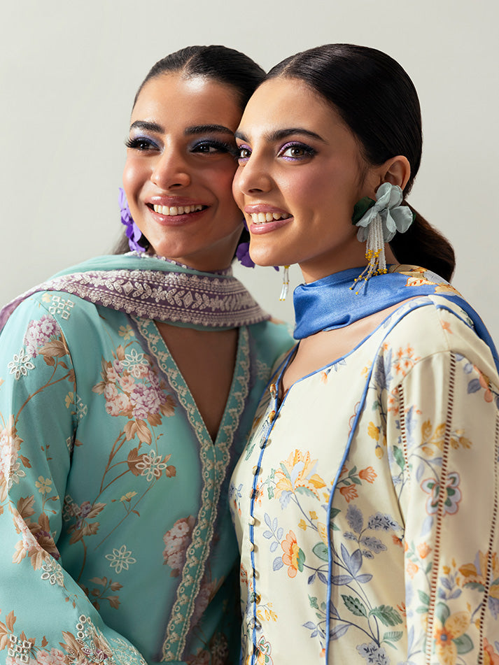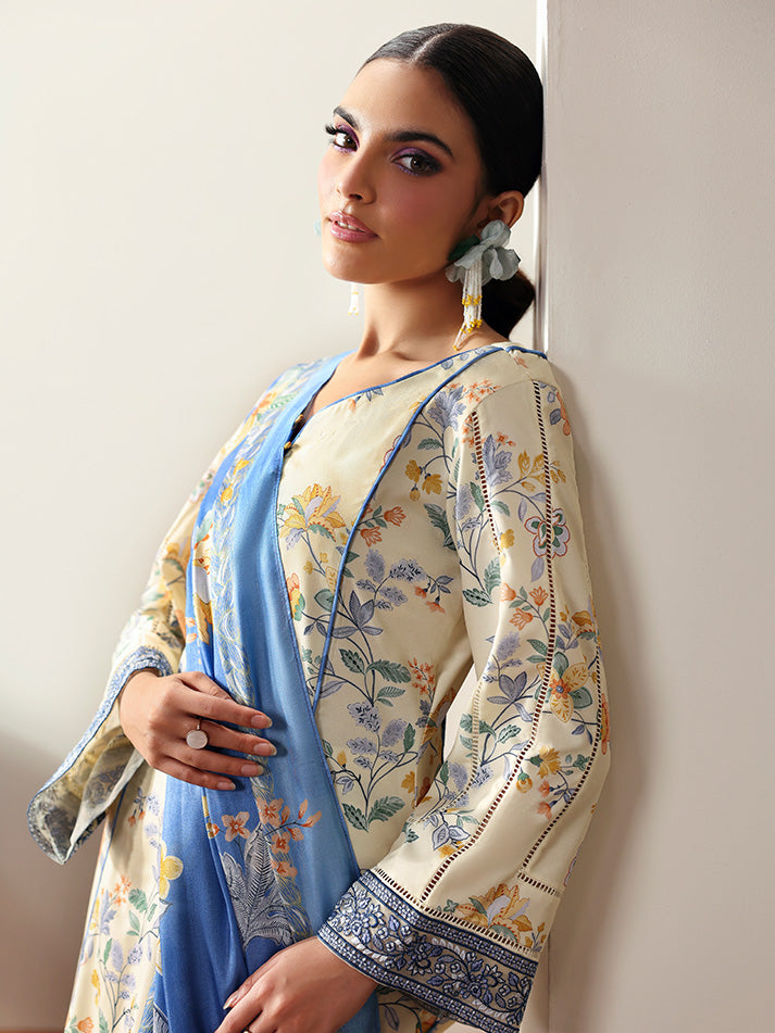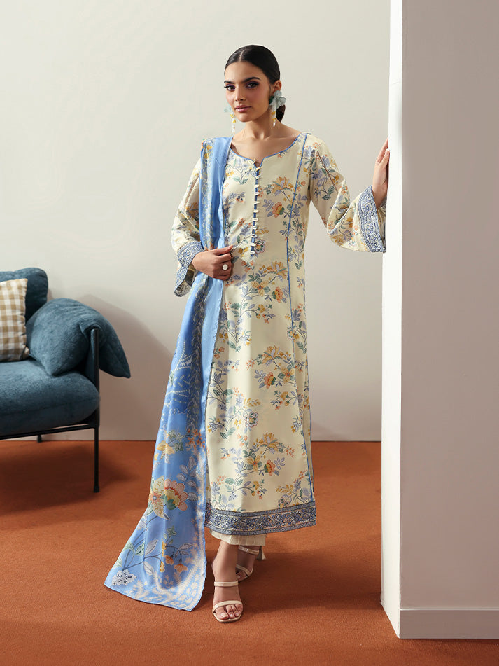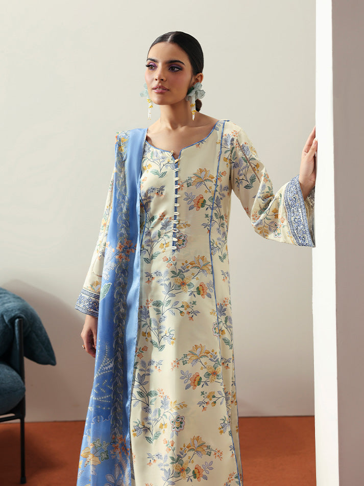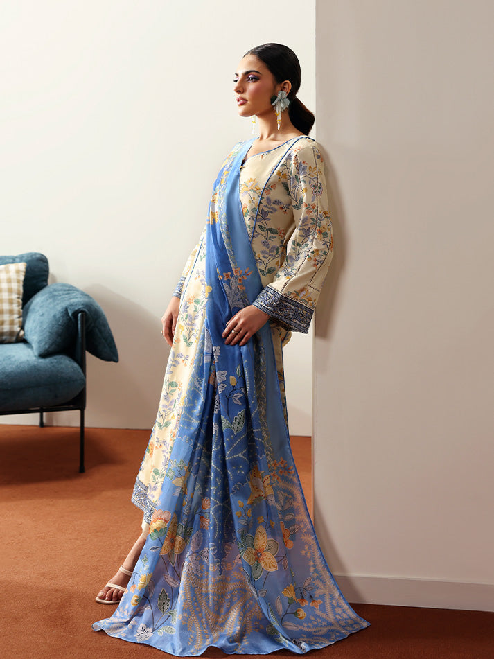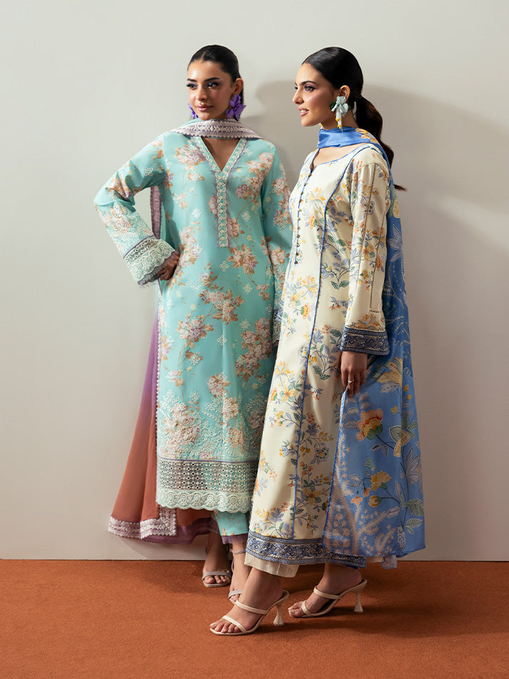 Soft and sophisticated, Elaris is crafted in a delicate pale butter yellow hue that radiates quiet elegance. The A-line shirt features beautifully embroidered organza borders on the front and sleeves, adding graceful dimension to the silhouette. A two-toned chatta patti trim lends a subtle yet striking contrast to the overall design. Paired with a printed silk dupatta and a comfortable plain poly lawn trouser, this ensemble beautifully blends tradition with modern charm.
