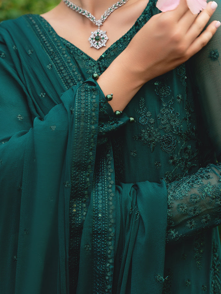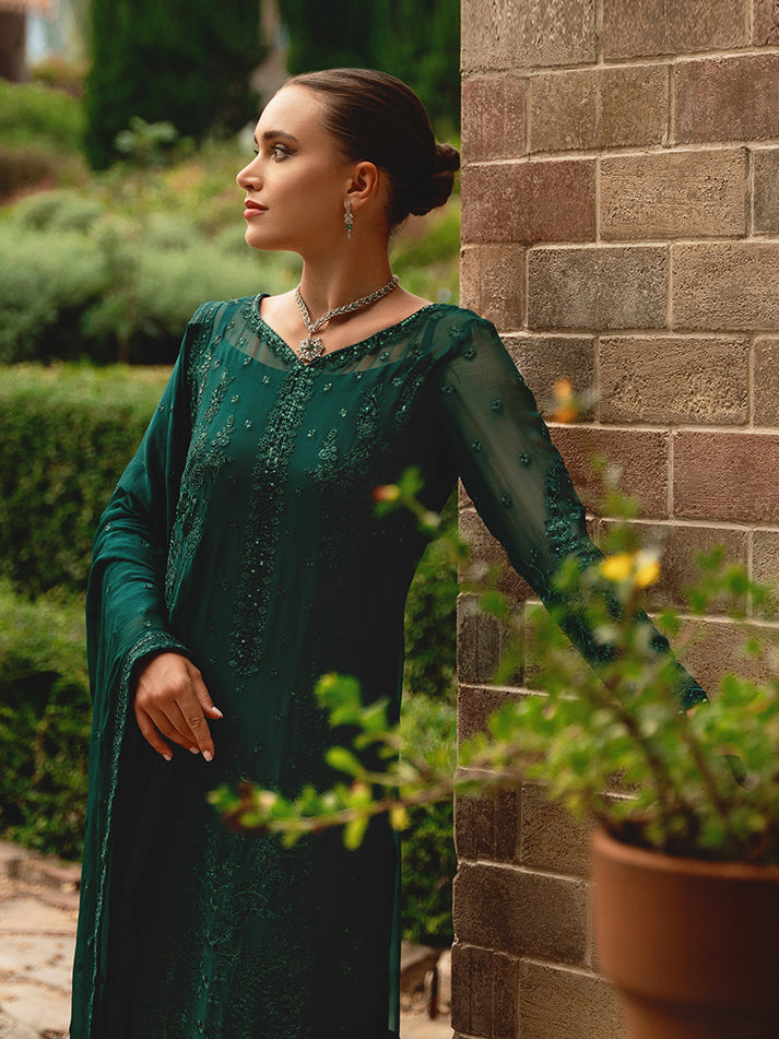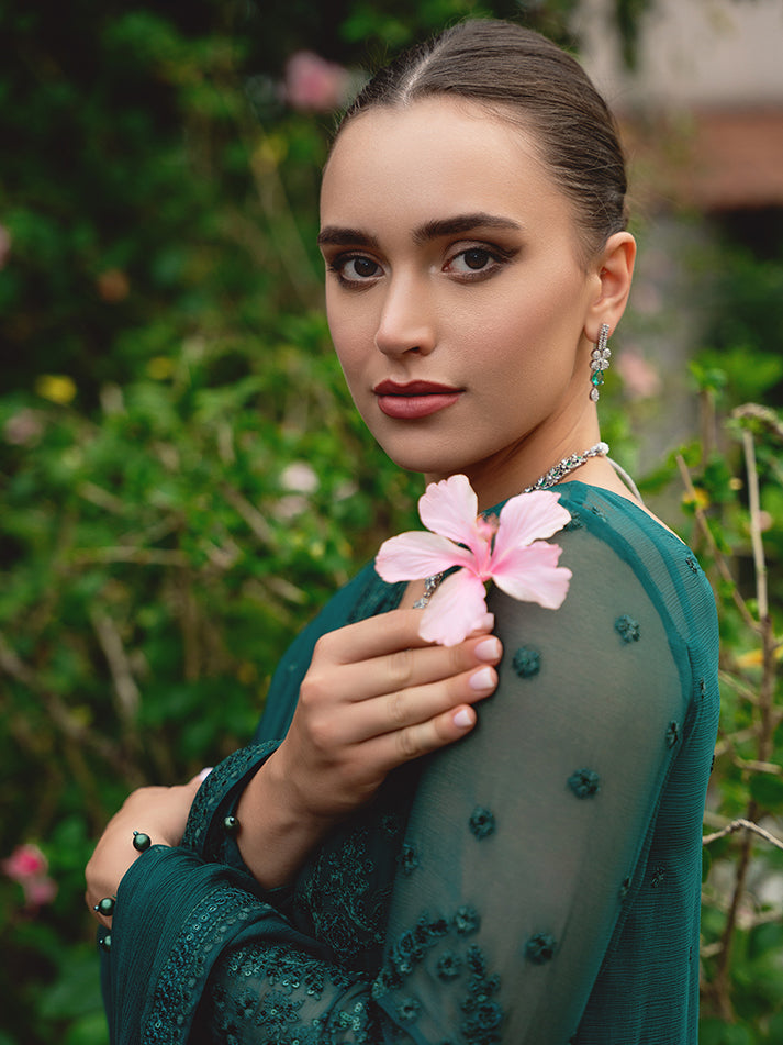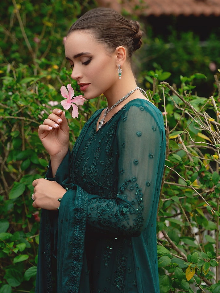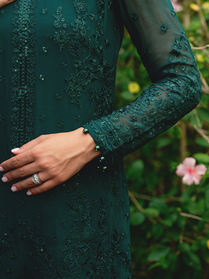 Elysia, from our Embroidered Pret Collection, beckons from the heart of a lush green forest, where sunlight filters through emerald leaves and melodies fill the air. This chiffon ensemble is intricately rendered on a captivating shade of emerald green and is adorned with delicate sequin work. It evokes the serene beauty of nature. With tis shimmering dupatta and raw silk trouser, the outfit embraces timeless elegance.