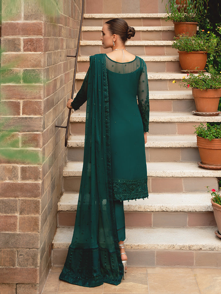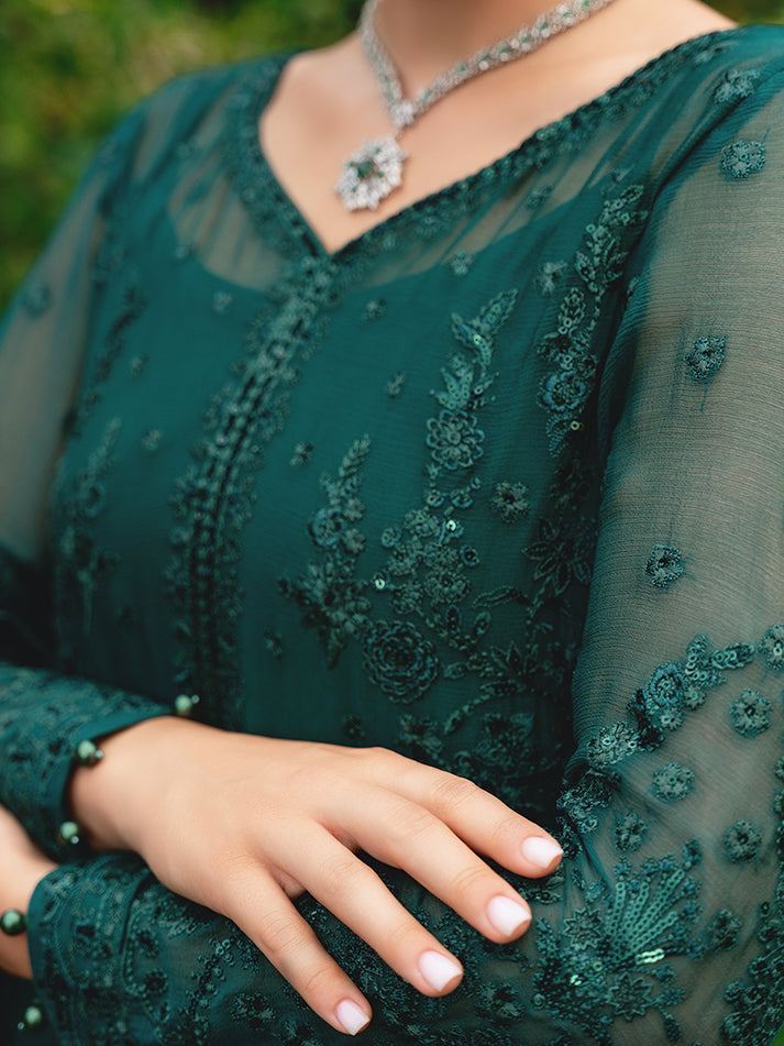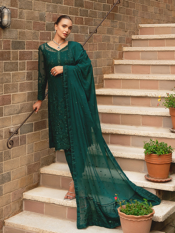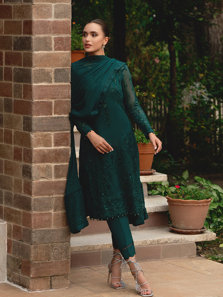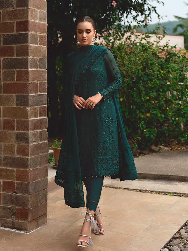 Elysia, from our Embroidered Pret Collection, beckons from the heart of a lush green forest, where sunlight filters through emerald leaves and melodies fill the air. This chiffon ensemble is intricately rendered on a captivating shade of emerald green and is adorned with delicate sequin work. It evokes the serene beauty of nature. With tis shimmering dupatta and raw silk trouser, the outfit embraces timeless elegance.