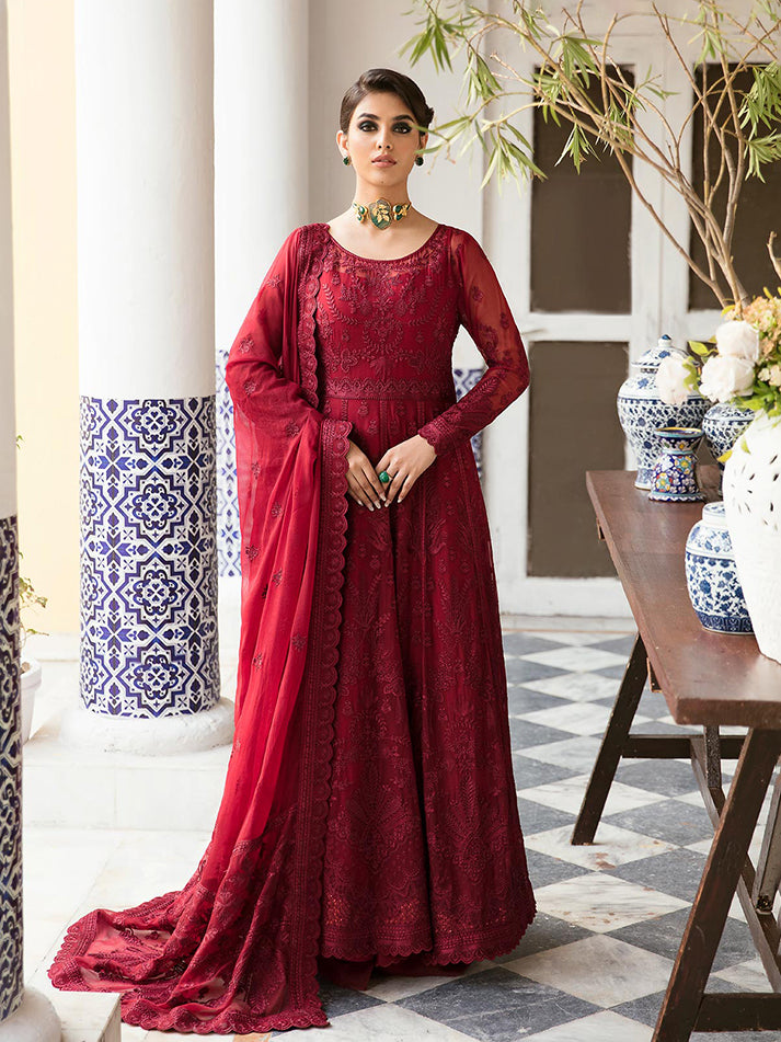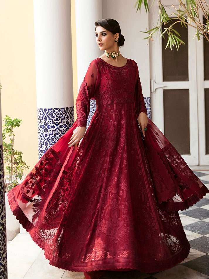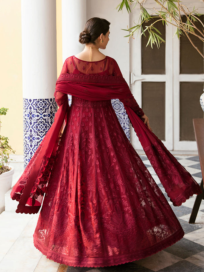 Garnet is our signature 12-panelled chiffon kalidaar gown adorned with intricately detailed resham embroidery with meticulous attention to detail. The outfit features matt sequined embroidery with an embroidered chiffon dupatta with heavy dupatta pallu extensions. Exquisite four-sided borders, neatly embroidered on chiffon, complete the look for the dupatta.?