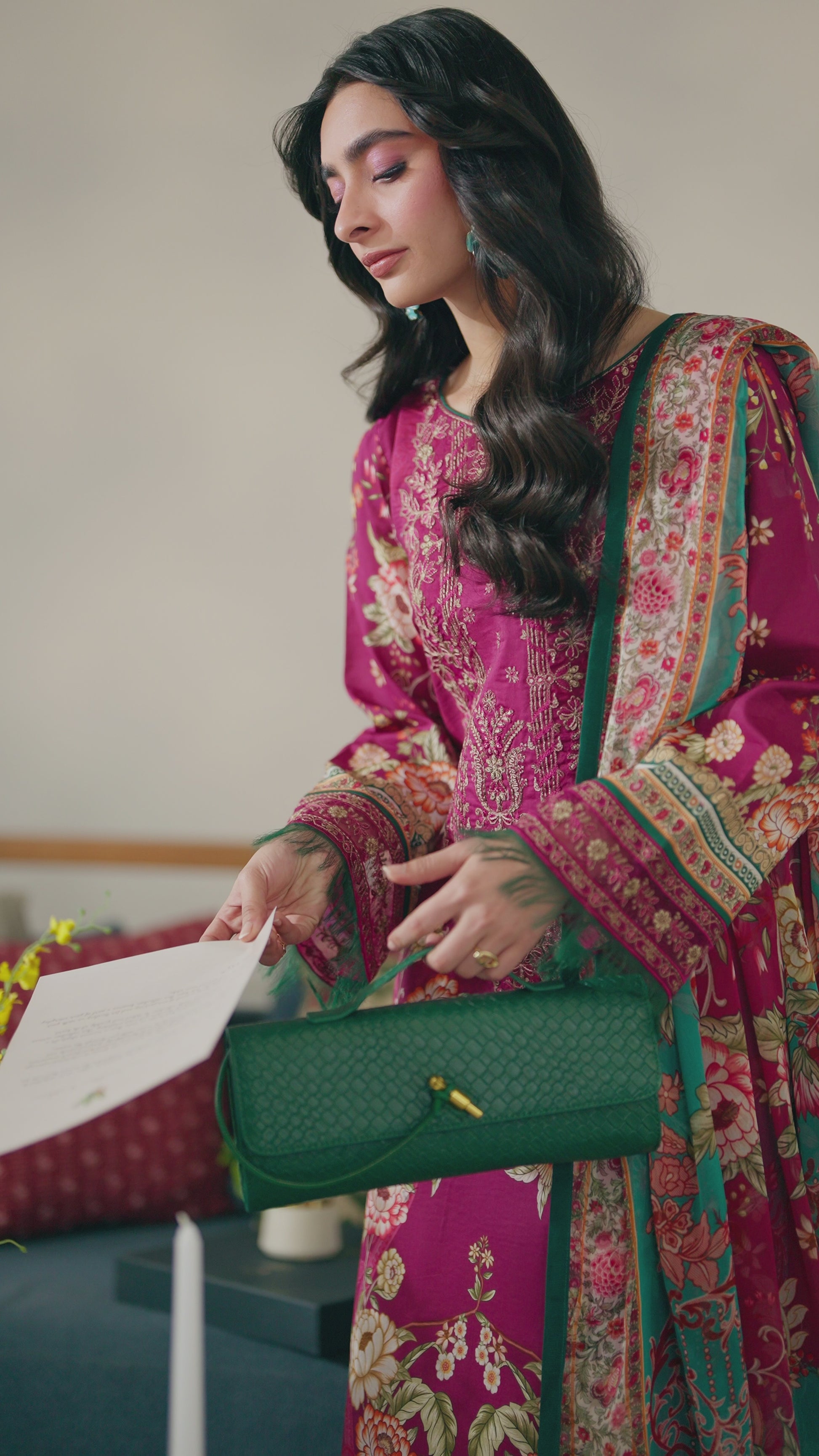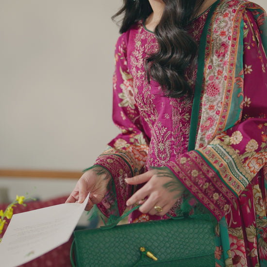 Turn heads in this striking red lawn ensemble, crafted for festive charm and everyday elegance. The printed lawn shirt is adorned with a finely embroidered neckline and a delicate embroidered front border, enhanced by embroidered motifs on the sleeves. The coordinating printed cotton trousers feature subtle embroidered motifs, while the airy chiffon dupatta completes the ensemble with flowing sophistication. Perfect for vibrant summer days and special occasions, this outfit balances bold color with intricate detailing.