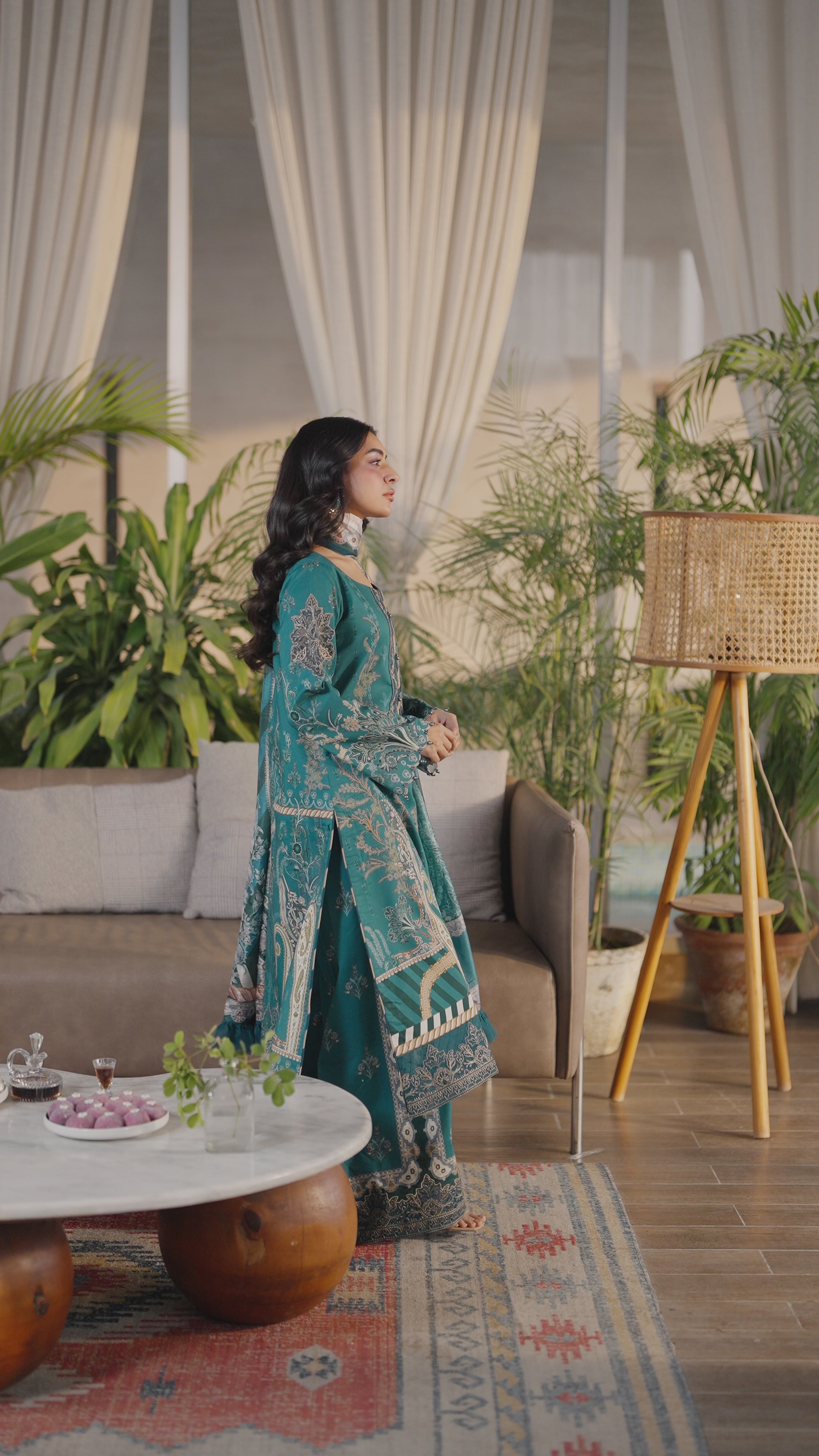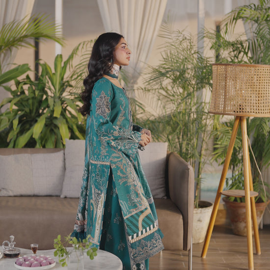 Refresh your summer style with this elegant teal lawn ensemble, crafted to balance comfort with refined detailing. The printed lawn shirt is beautifully enhanced with an embroidered organza neckline border, a delicately embroidered organza front border, and graceful embroidered motifs on the sleeves, finished with embroidered organza sleeve borders for a polished look. Paired with a flowing printed silk dupatta and printed cotton trousers, this ensemble offers effortless sophistication for everyday wear.