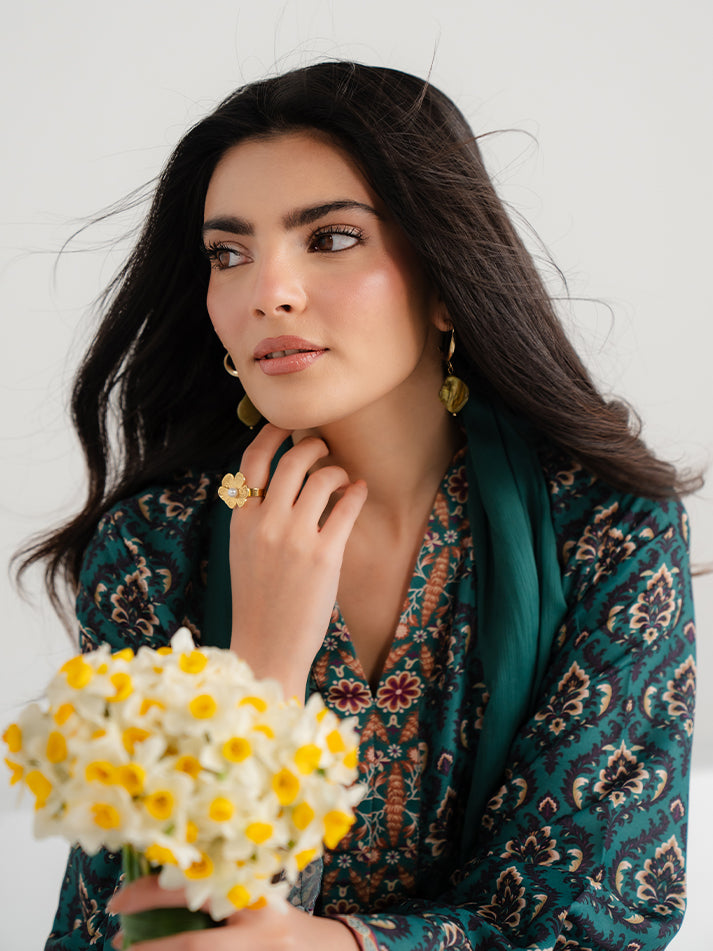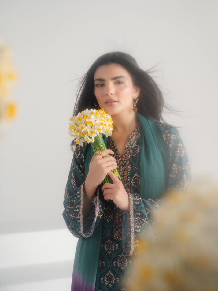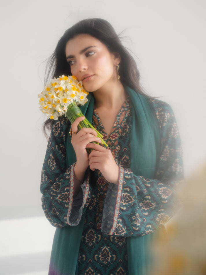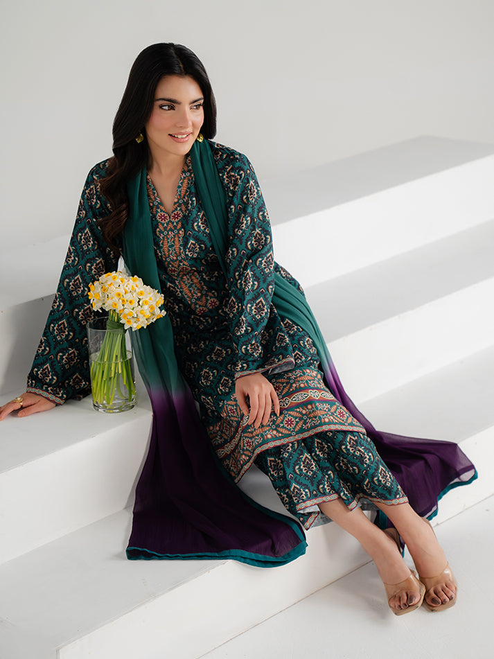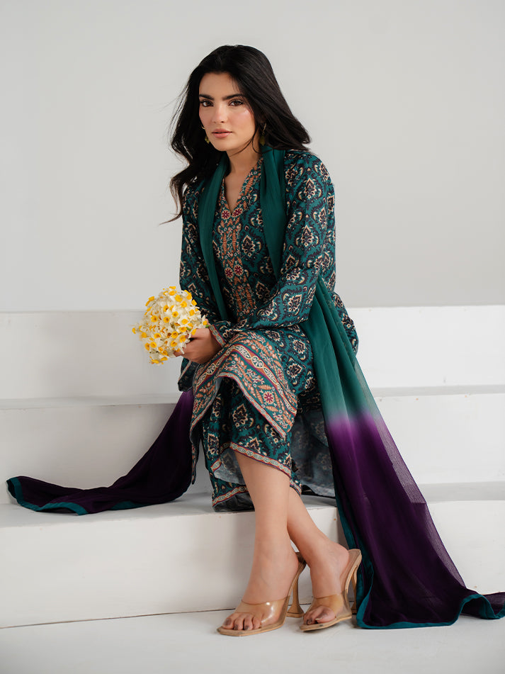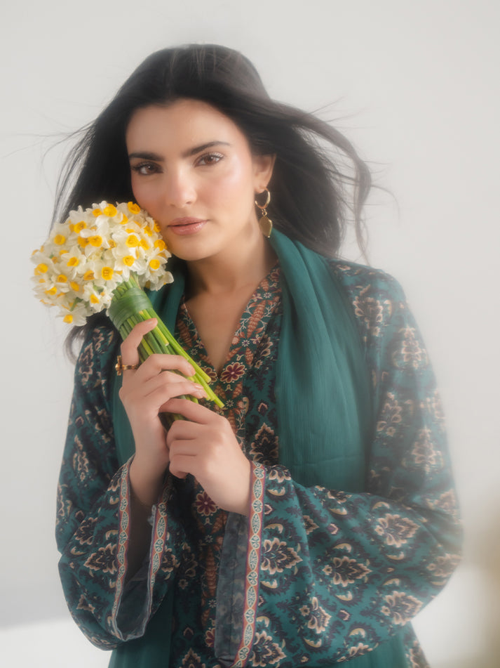 A refreshing green printed lawn ensemble designed for effortless seasonal elegance. The shirt and matching trouser are crafted from soft, breathable lawn fabric, adorned with eye-catching prints that enhance its charm. A perfect blend of comfort and refined everyday style.