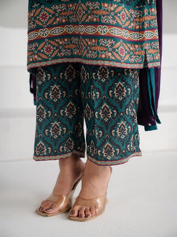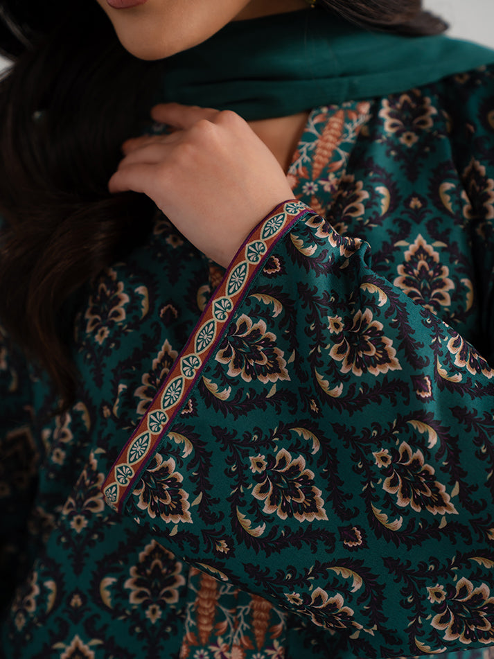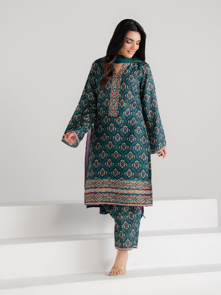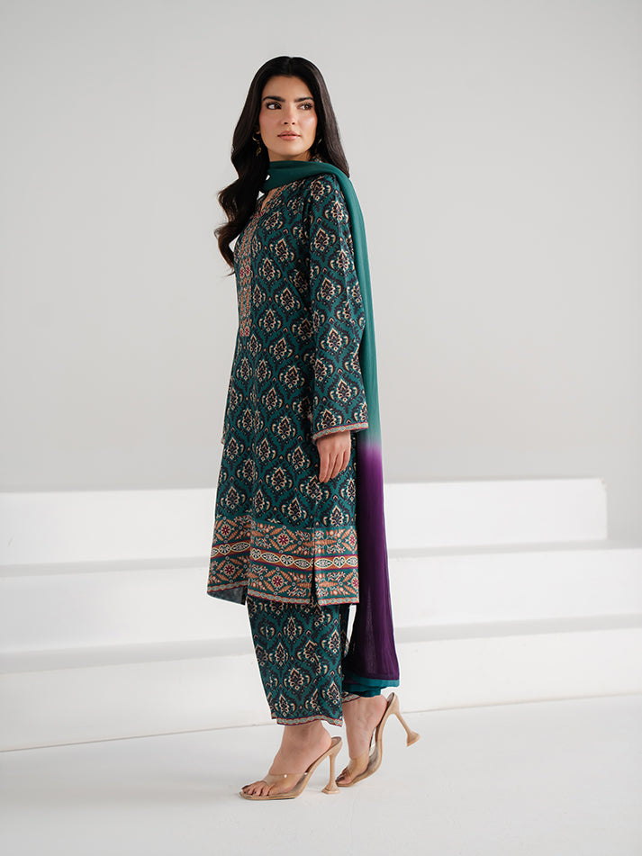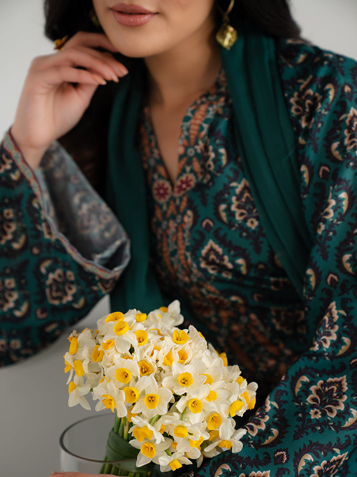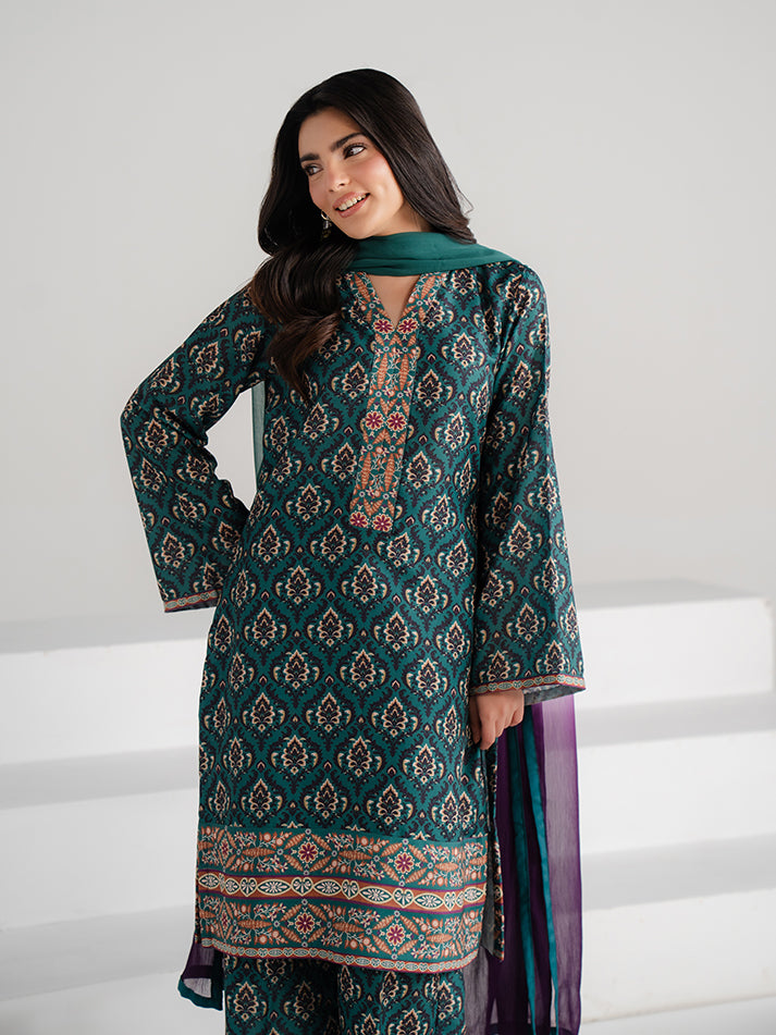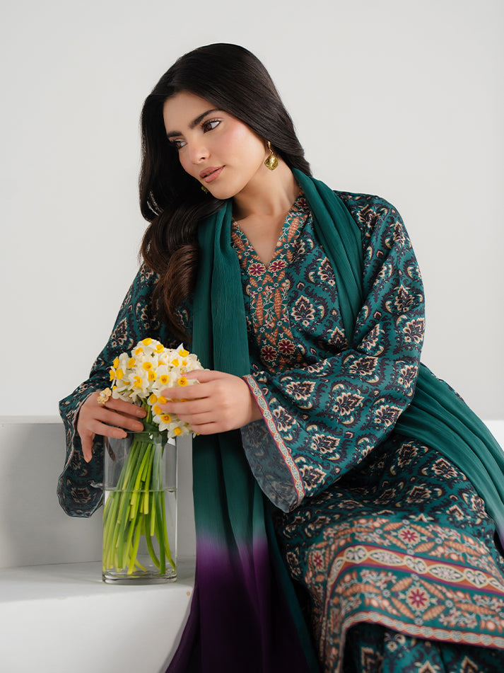 A refreshing green printed lawn ensemble designed for effortless seasonal elegance. The shirt and matching trouser are crafted from soft, breathable lawn fabric, adorned with eye-catching prints that enhance its charm. A perfect blend of comfort and refined everyday style.