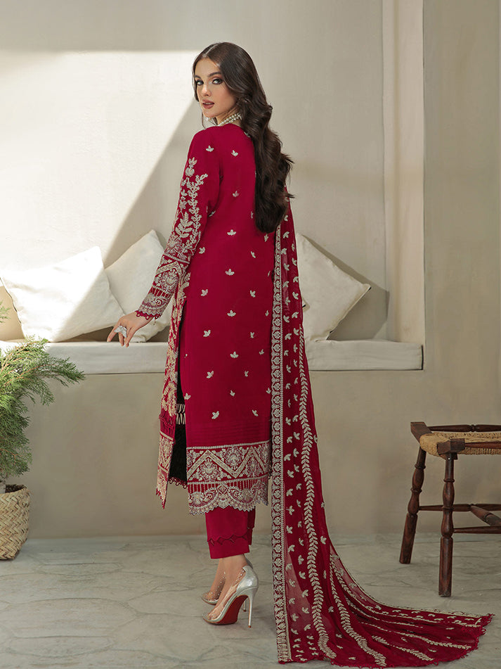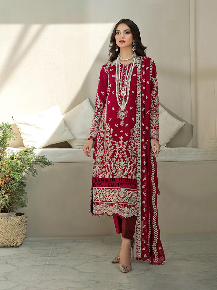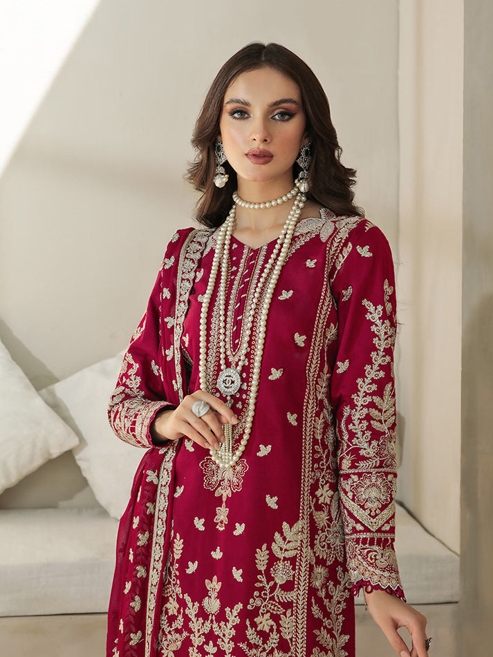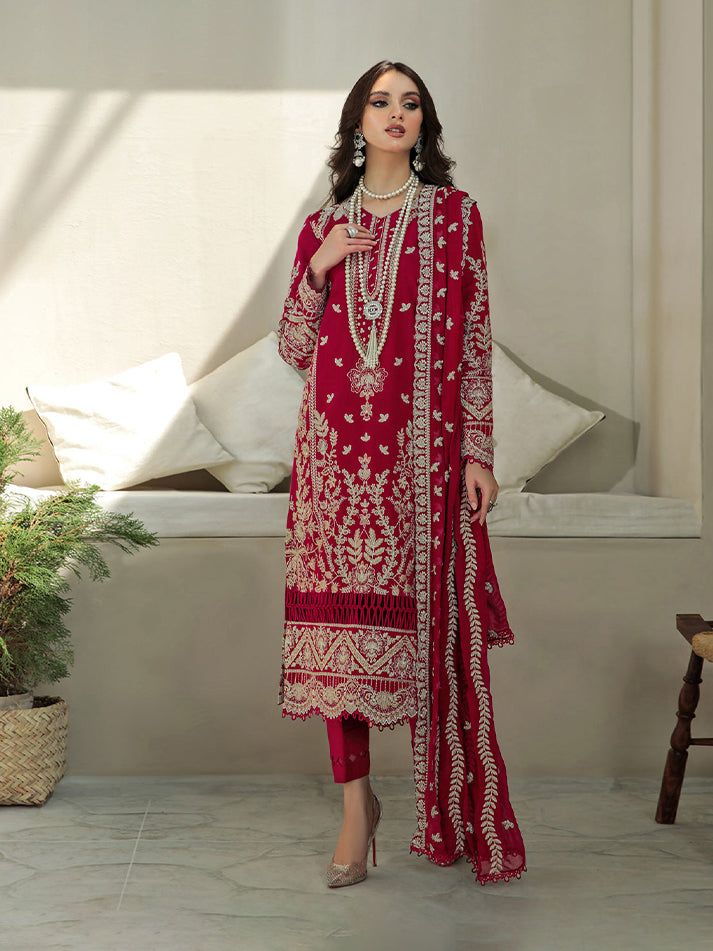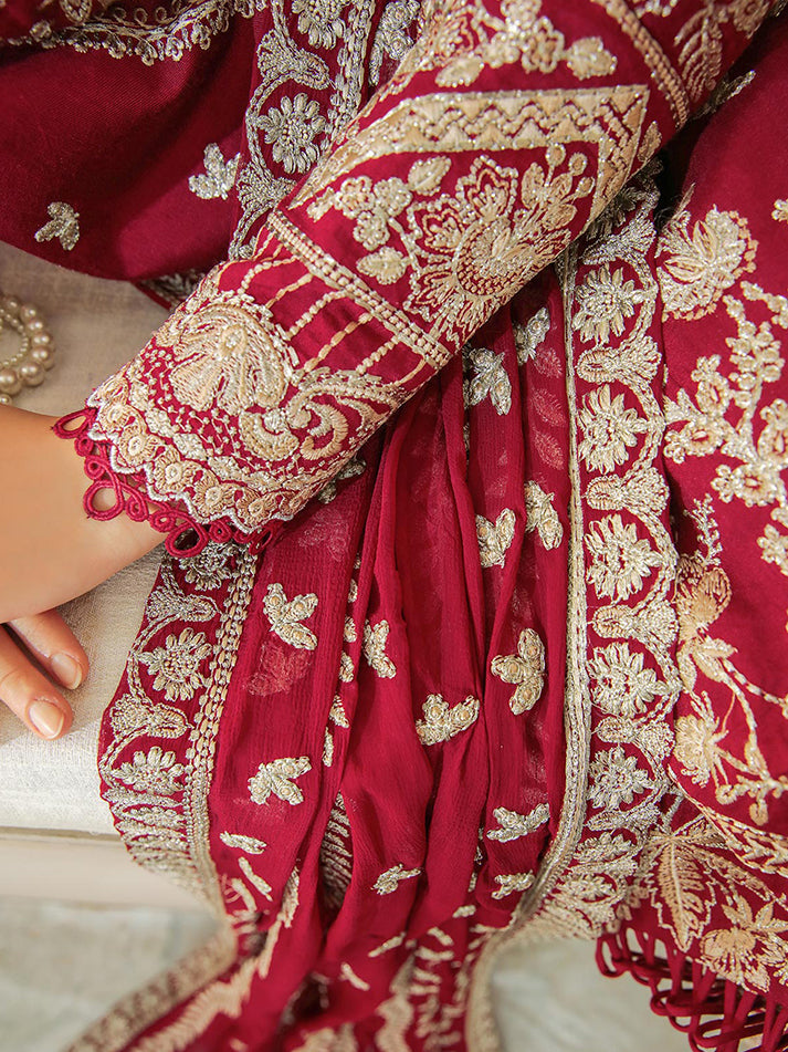 Lyanna is a stunning combination of dull gold and ivory white embroidered detailing on a deep red khadi net base. Paired with a fully embroidered, linear-patterned chiffon dupatta, the outfit is quintessentially Gulaal. With fitted sleeves ending off with dyed laces, that have been carefully selected and used throughout the collection, this outfit has been a sheer joy to create. Just what you need to make the perfect style statement.?