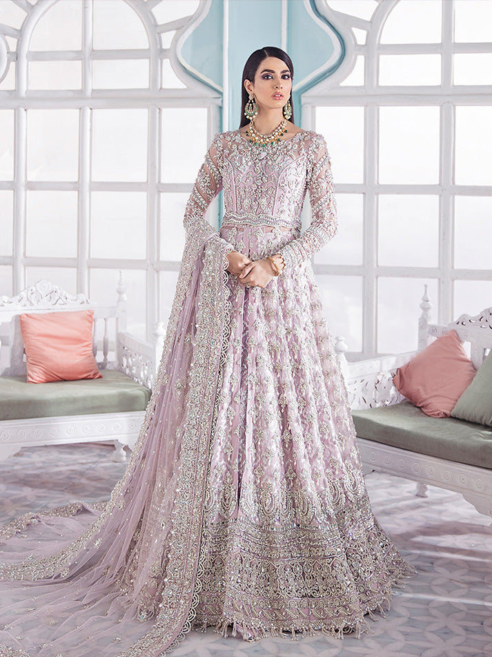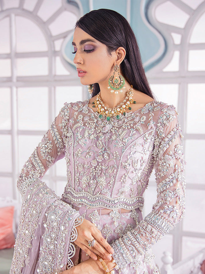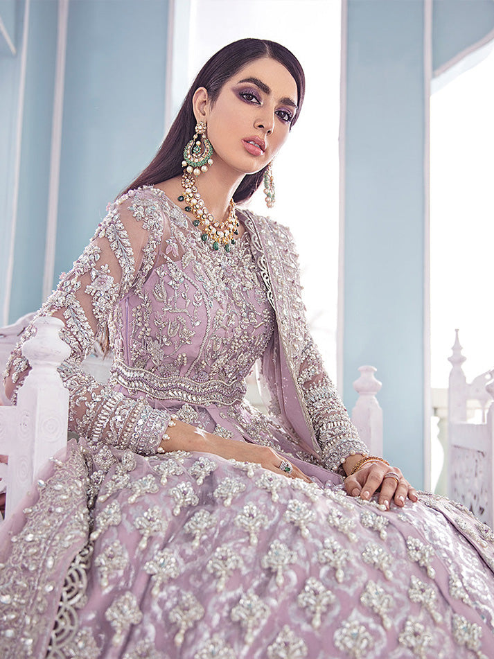 A flamboyant soft lilac flared lehnga choli adorned with silver accents, Mahpara, is comely encrusted with heavy embellishments like crystals, swarovskis, pearls and detailed silver filigree. It is paired with a heavy embellished dupatta perfect for your big day