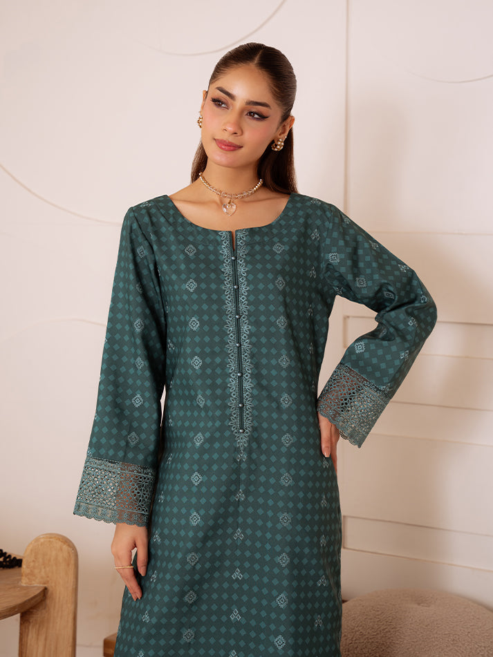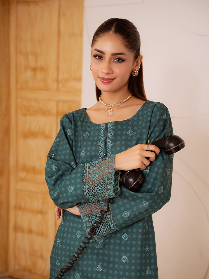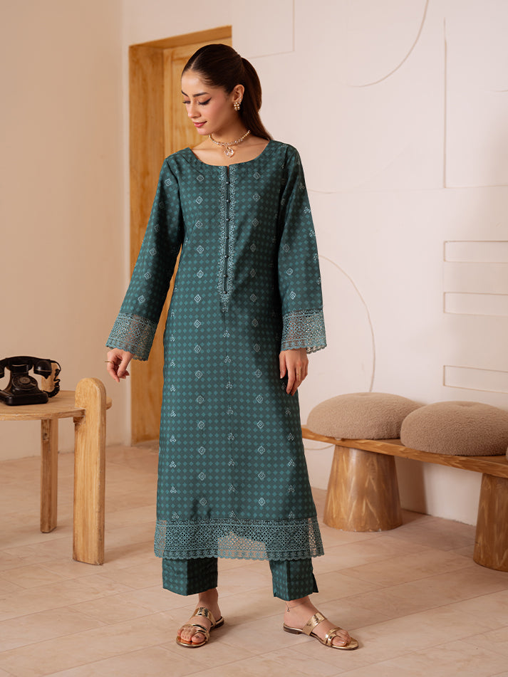Midnight Fern is a sophisticated two-piece set crafted from premium poly lawn in a rich teal green base. The ensemble features delicate teal embroidered lace detailing along the neckline, sleeves, and hem, adding a graceful finish to its modern silhouette. Perfect for both casual elegance and refined daywear, this set blends style with subtle charm.