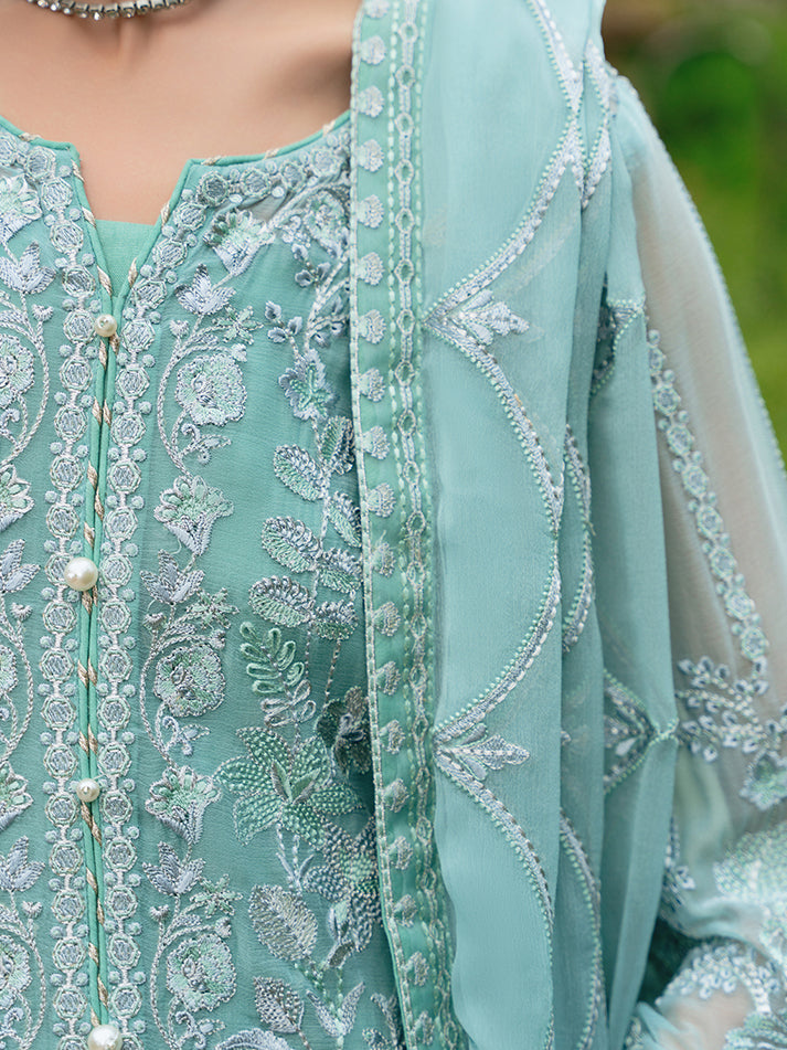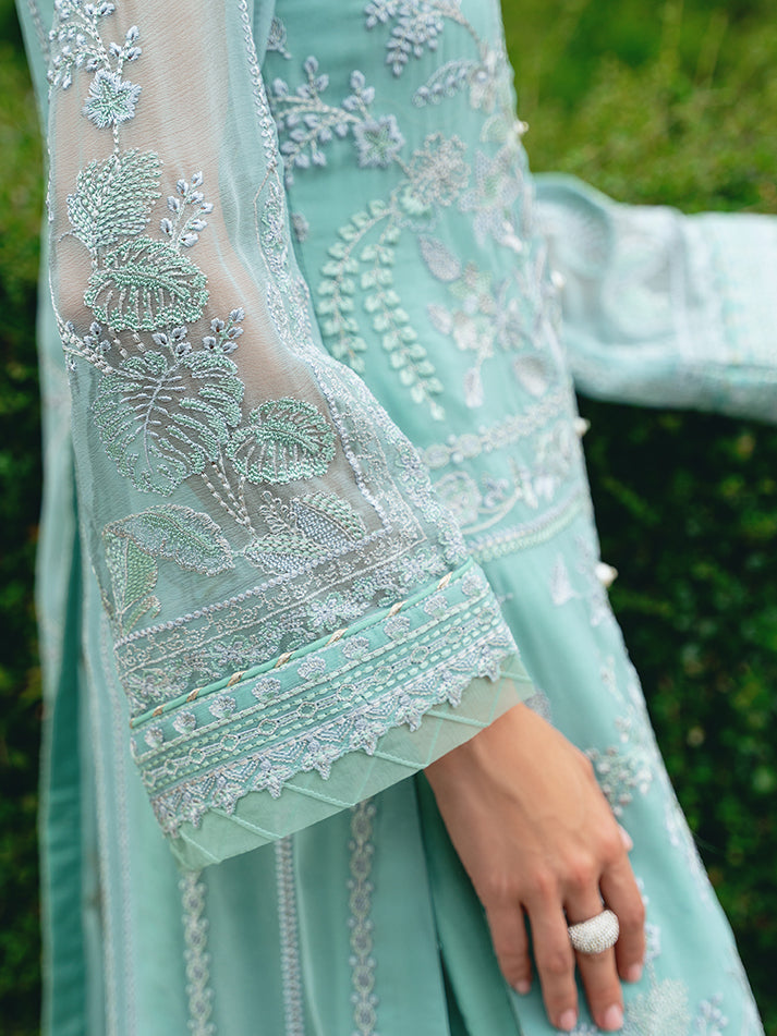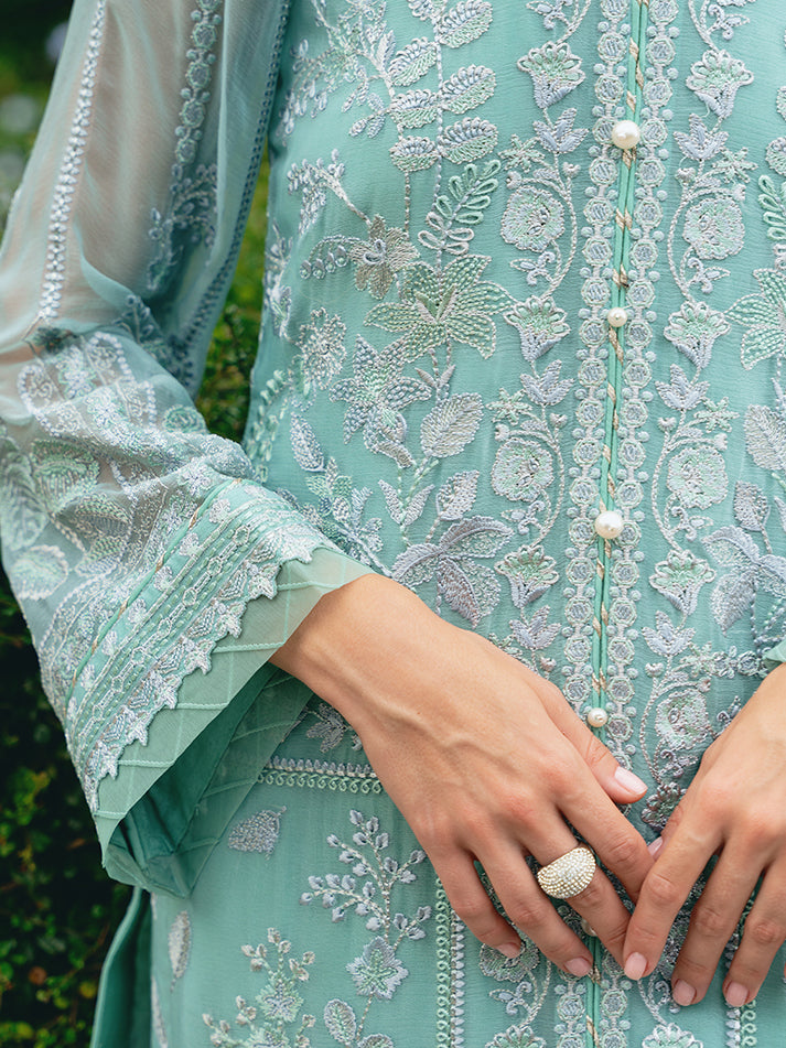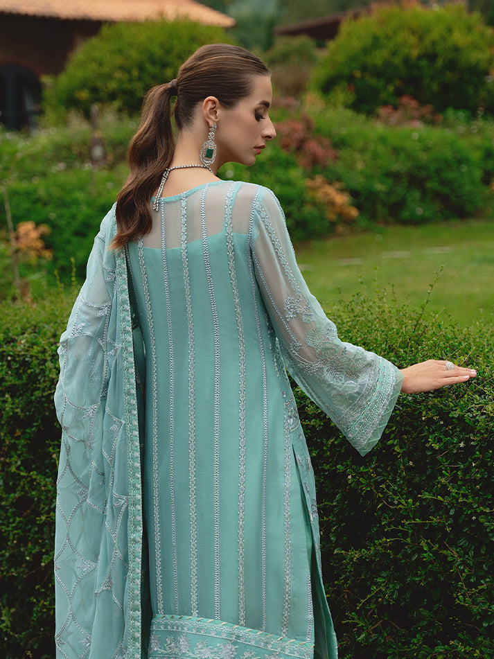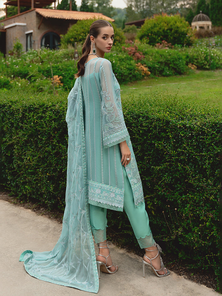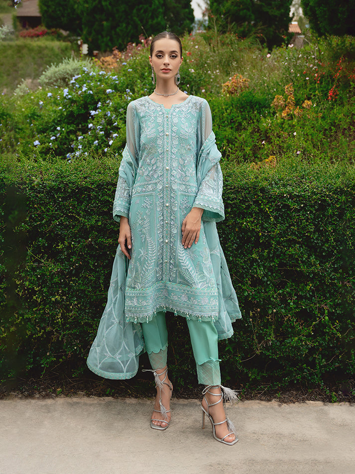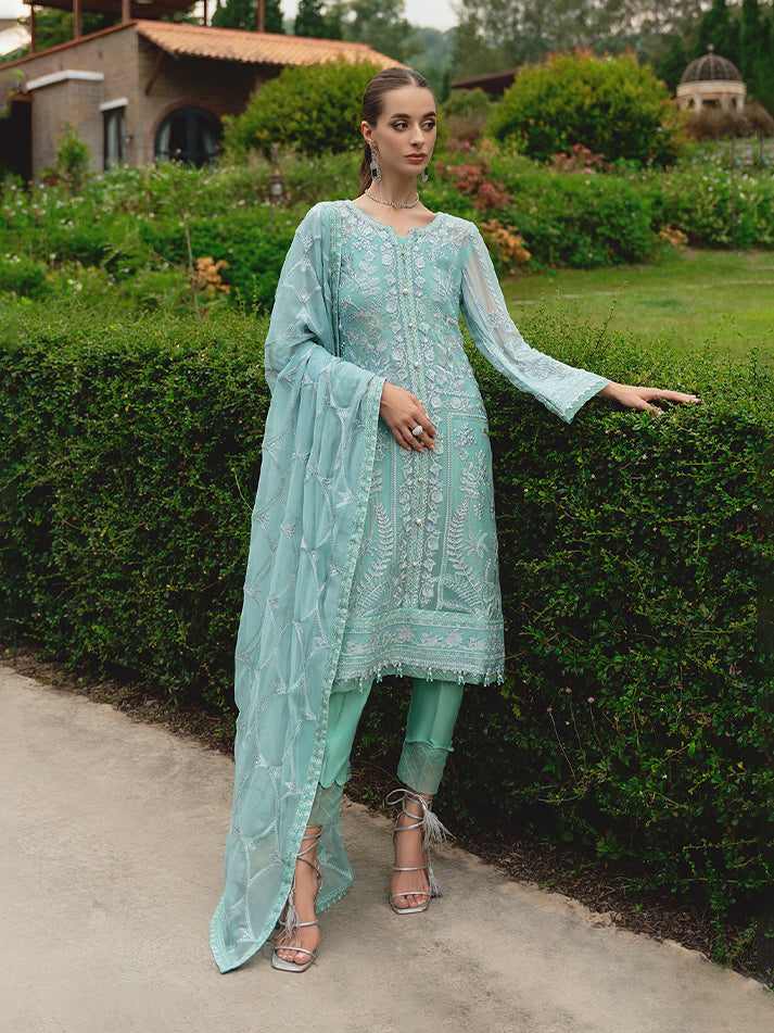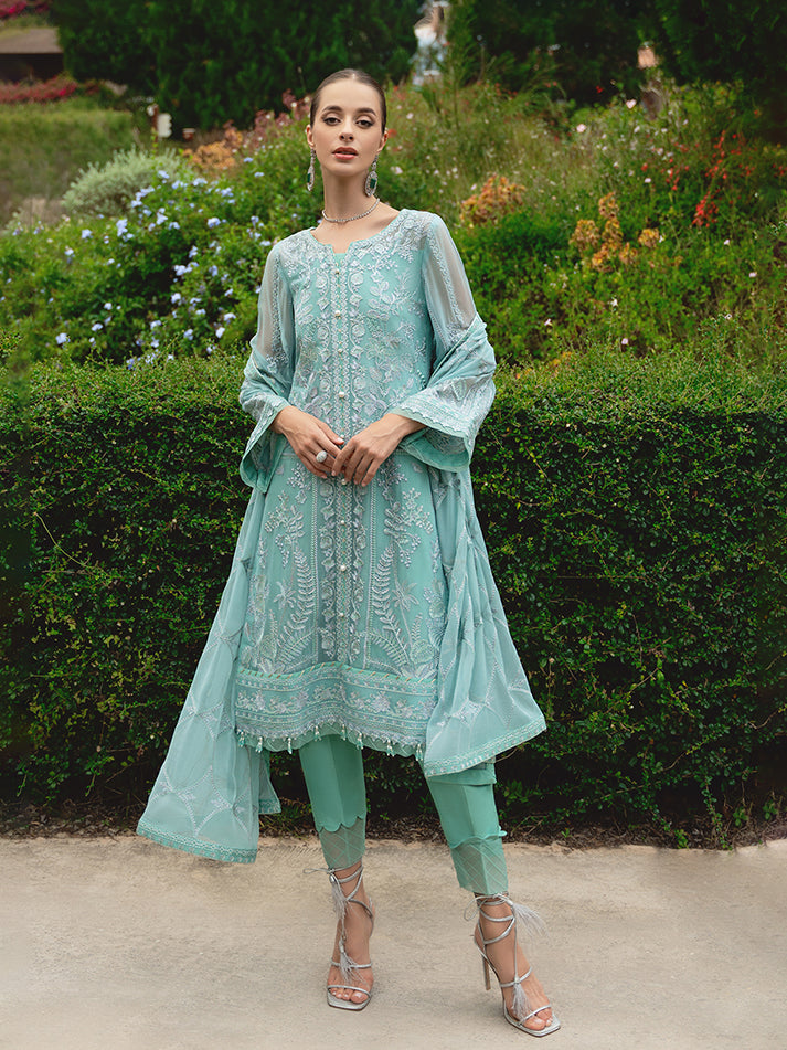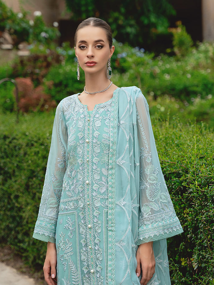 Nissa? celestial gem aglow in soft azure, exuding an ethereal charm. This captivating ensemble weaves a mesmerizing tale, showcasing an intricately embroidered dupatta. Harmoniously paired with tonal pants, 'Nissa' embodies the epitome of elegance and grace.