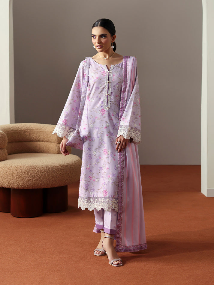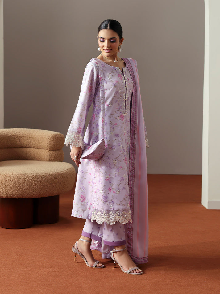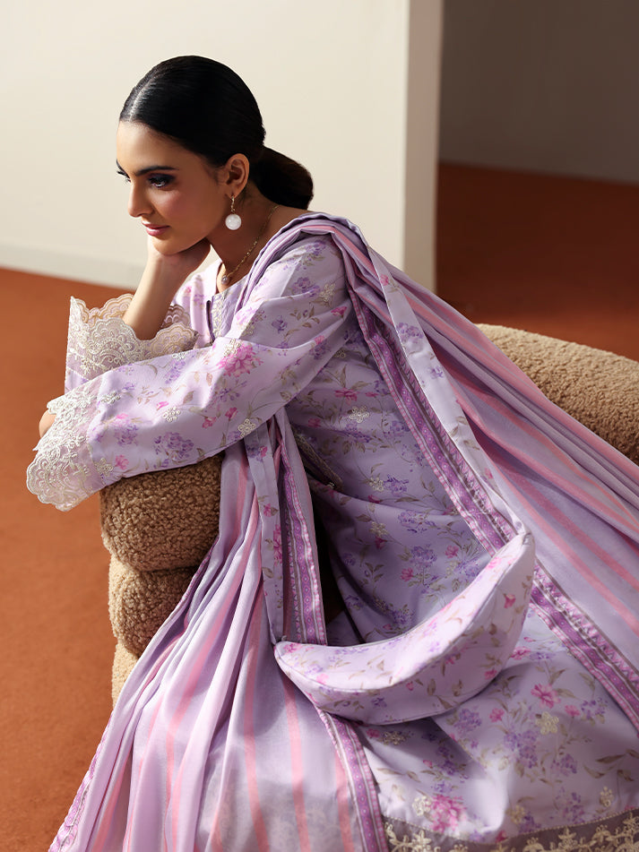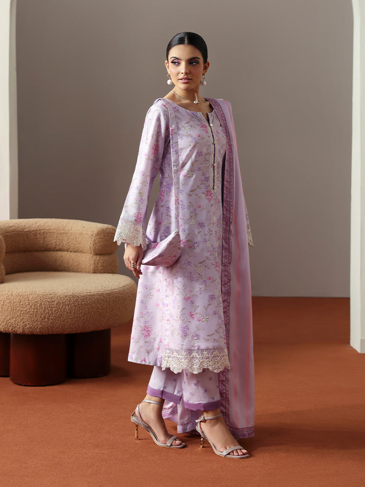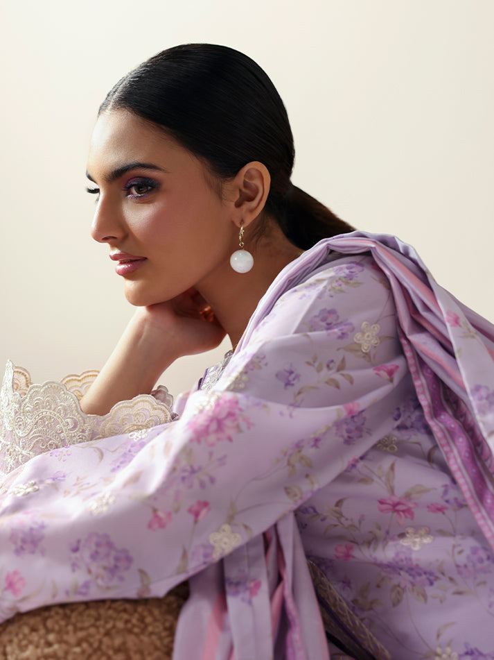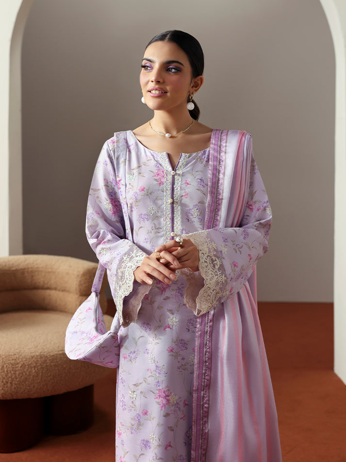 Quince brings a graceful charm to your wardrobe with its soft lilac hue and beautifully coordinated prints. The shirt and trouser feature a delicate all-over print, while the shirt’s front is elevated with an embroidered border that adds refined detail. The neckline and sleeves are adorned with intricate embroidery, including an organza border on the sleeves for a touch of texture and elegance. A printed silk dupatta completes the look, making Quince a perfect blend of sophistication and everyday ease.