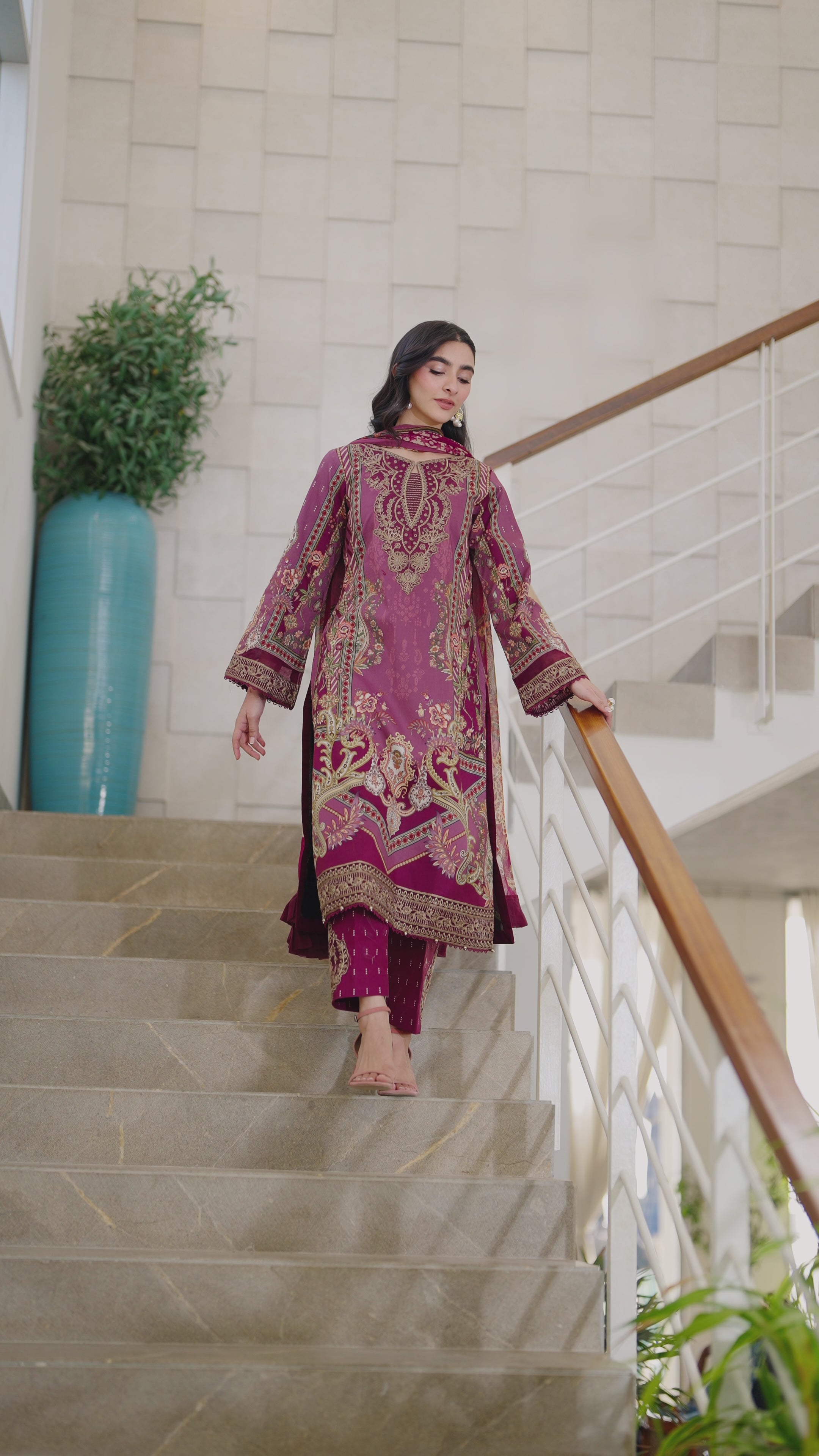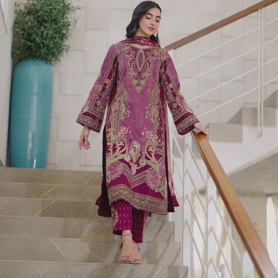 Make a bold statement this season with this red lawn ensemble, designed for effortless festive elegance. The printed lawn shirt features a beautifully embroidered neckline and a delicately embroidered front border, complemented by embroidered motifs on the sleeves. The coordinating printed cotton trousers are finished with subtle embroidered motifs, while the flowing chiffon dupatta adds a graceful touch. This ensemble perfectly blends vibrant color, intricate detailing, and breathable fabrics for polished, head-turning summer wear.