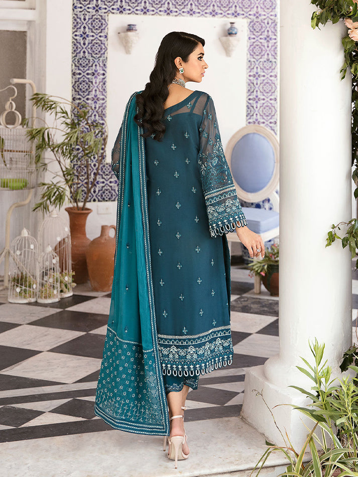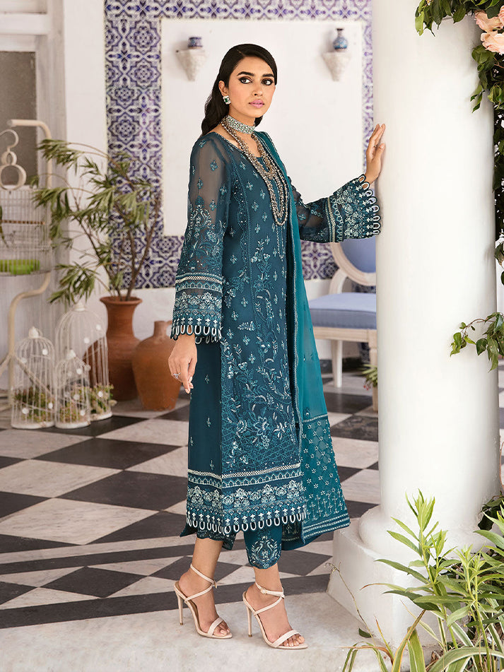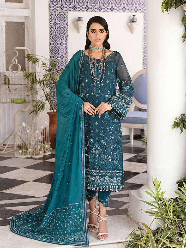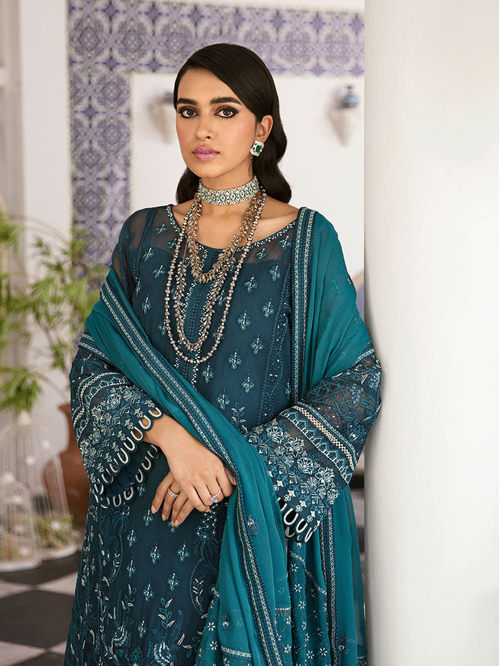 Experience the exquisite elegance of Reyah (item code GL-EP23V1-12) as you indulge in its ethereal charm. Delicately adorned with intricate embroidery, the chiffon front exudes grace, while the sleeves showcase meticulous craftsmanship. To complete the ensemble, a finely crafted chiffon dupatta, embellished with embroidery and adorned with raw silk borders on all four sides, adds a regal touch. ?With a dyed inner shirt lining and a dyed raw silk trouser, this attire showcases exceptional craftsmanship.