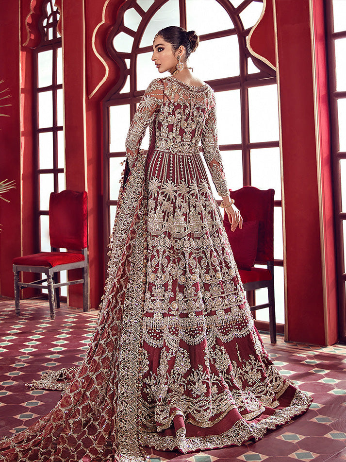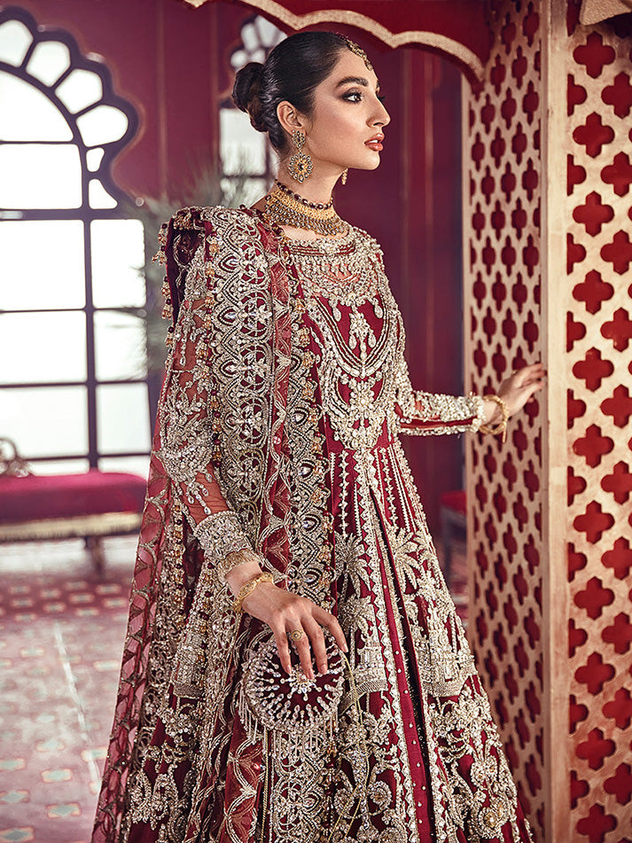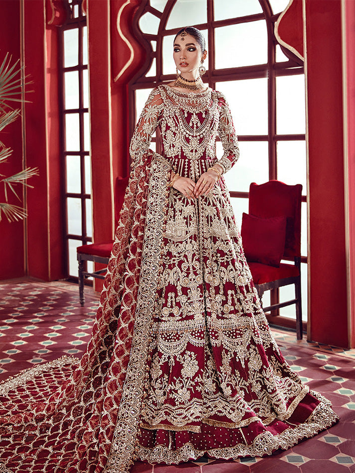 Serat is an alluring heavily embellished Gulaal bridal from our bridal collection Shehrnaz. A statuesque panelled gown in deep red exquisitely embellished with crystals, swarovskis, pearls, metallic threads and worn with a heavily composed dupata and a floor length gown with a heavily hand-worked border. Just the ideal outfit for a baraat function.