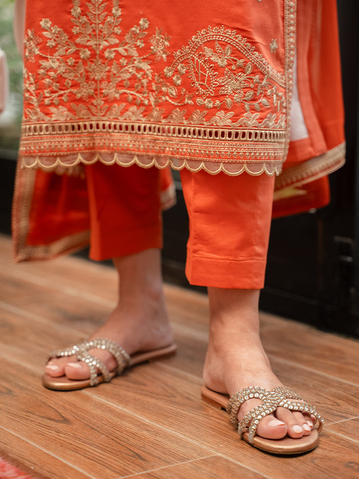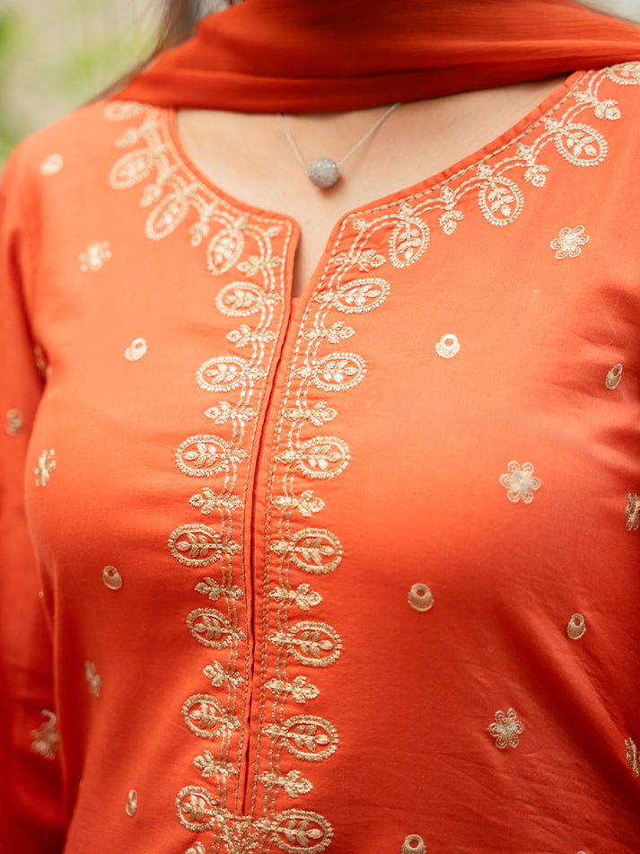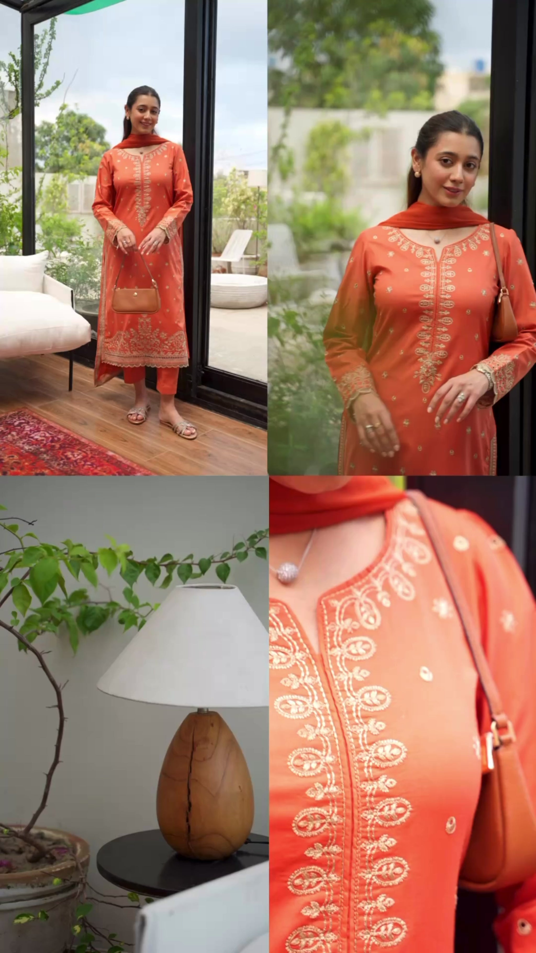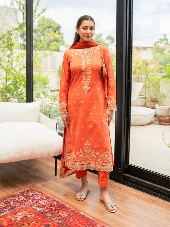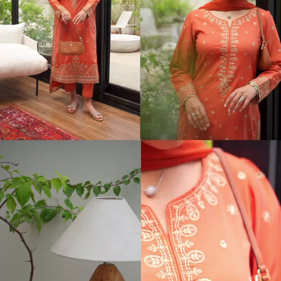 Sunstone is a radiant three-piece ensemble in a rich rust base, crafted from premium lawn. The shirt is fully embroidered, showcasing intricate patterns that highlight timeless craftsmanship. Chikankari embroidered lawn borders on the shirt and sleeves add delicate finesse, while the dyed chiffon dupatta with an embroidered organza border brings a graceful finishing touch. Paired with a comfortable cotton trouser, Sunstone is the perfect choice for effortless sophistication.